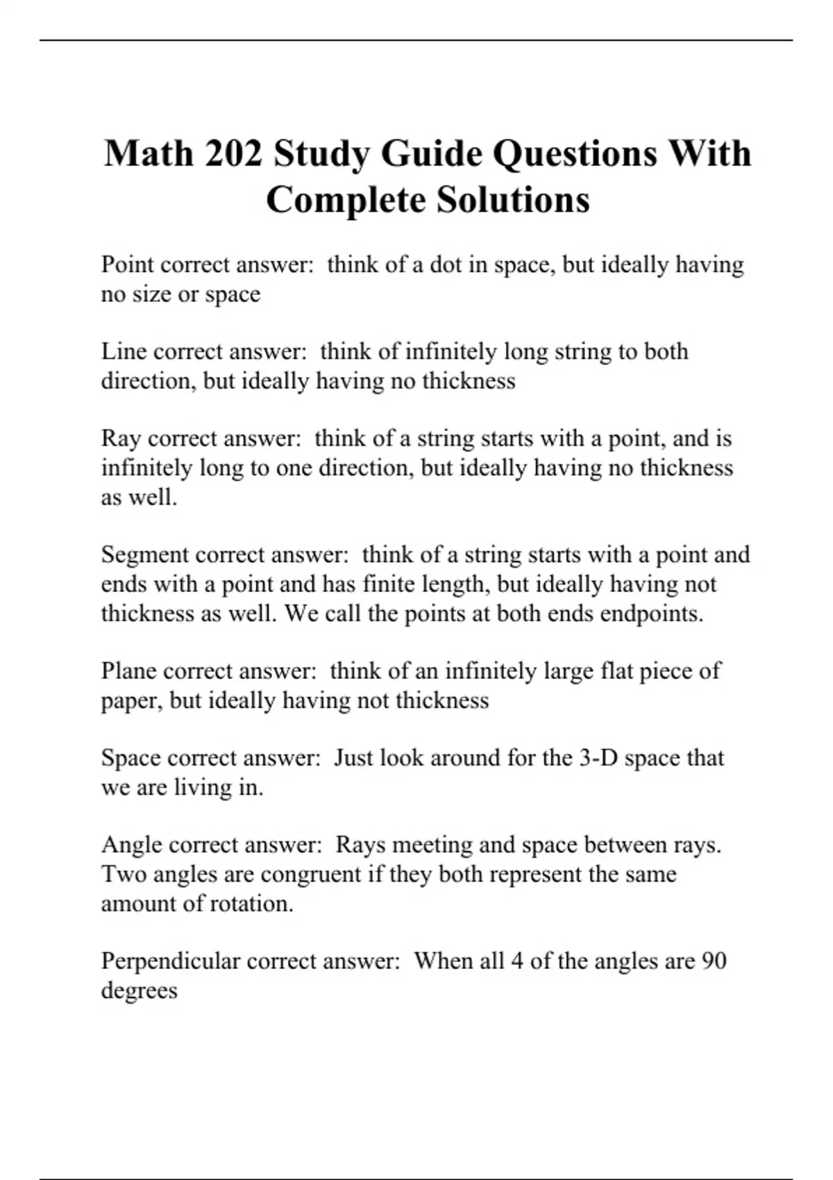 Point correct answer: think of a dot in space, but ideally having no size or space Line correct answer: think of infinitely long string to both direction, but ideally having no thickness Ray correct answer: think of a string starts with a point, and is infinitely long to one direction, but ideally having no thickness as well. Segment correct answer: think of a string starts with a point and ends with a point and has finite length, but ideally having not thickness as well. We call the points at both ends endpoints. Plane correct answer: think of an infinitely large flat piece of paper, but ideally having not thickness Space correct answer: Just look around for the 3-D space that we are living in. Angle correct answer: Rays meeting and space between rays. Two angles are congruent if they both represent the same amount of rotation. Perpendicular correct answer: When all 4 of the angles are 90 degrees Parallel correct answer: Two lines in a plane that never meet Parallel Postulate correct answer: If two parallel lines are cut by traversal, then the corresponding angles are equal. A postulate means it is assumed to be true. Actually, the parallel postulate cannot be proved, and it is assumption that we have in the Euclidean geometry that we learn in math. Reflection correct answer: The normal line at a point on a surface is the line that passes through that point and is perpendicular to the surface at that point. Reflection of Light correct answer: Th