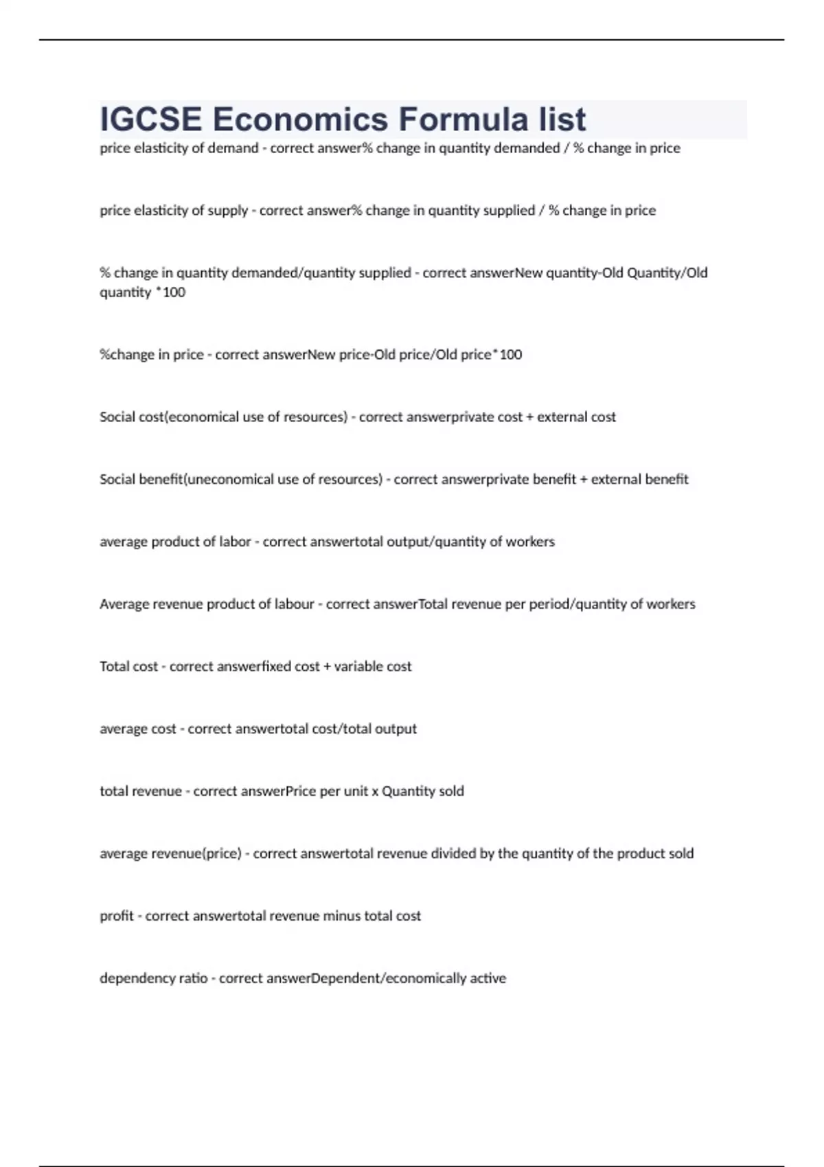 price elasticity of demand - correct answer% change in quantity demanded / % change in price price elasticity of supply - correct answer% change in quantity supplied / % change in price % change in quantity demanded/quantity supplied - correct answerNew quantity-Old Quantity/Old quantity *100 %change in price - correct answerNew price-Old price/Old price*100 Social cost(economical use of resources) - correct answerprivate cost + external cost Social benefit(uneconomical use of resources) - correct answerprivate benefit + external benefit average product of labor - correct answertotal output/quantity of workers Average revenue product of labour - correct answerTotal revenue per period/quantity of workers Total cost - correct answerfixed cost + variable cost average cost - correct answertotal cost/total output total revenue - correct answerPrice per unit x Quantity sold average revenue(price) - correct answertotal revenue divided by the quantity of the product sold profit - correct answertotal revenue minus total cost