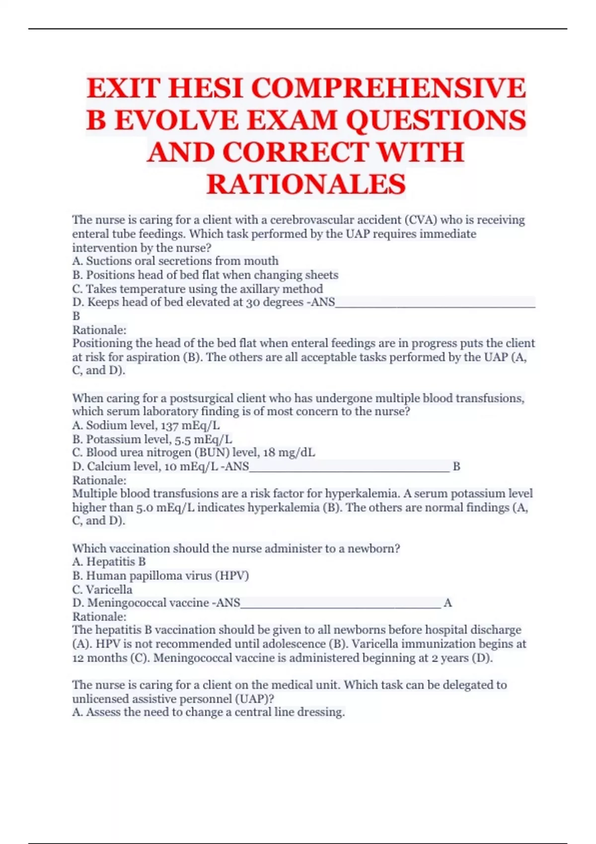 EXIT HESI COMPREHENSIVE B EVOLVE EXAM QUESTIONS AND CORRECT WITH RATIONALES