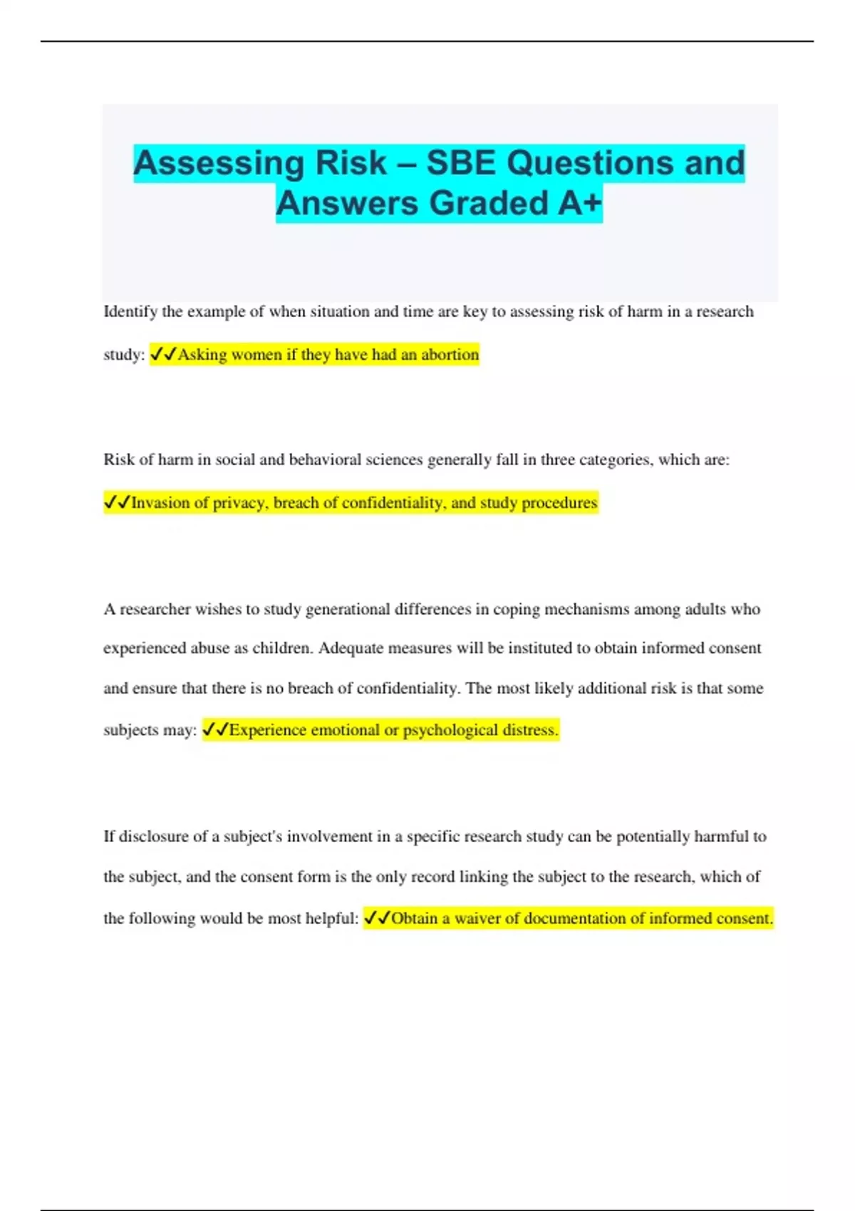 Assessing Risk – SBE Questions and Answers Graded A+ Identify the example of when situation and time are key to assessing risk of harm in a research study: Asking women if they have had an abortion Risk of harm in social and behavioral sciences generally fall in three categories, which are: Invasion of privacy, breach of confidentiality, and study procedures A researcher wishes to study generational differences in coping mechanisms among adults who experienced abuse as children. Adequate measures will be instituted to obtain informed consent and ensure that there is no breach of confidentiality. The most likely additional risk is that some subjects may: Experience emotional or psychological distress. If disclosure of a subject's involvement in a specific research study can be potentially harmful to the subject, and the consent form is the only record linking the subject to the research, which of the following would be most helpful: Obtain a waiver of documentation of informed consent. What statement about risks in social and behavioral sciences research is most accurate: Risks are specific to time, situation, and culture.