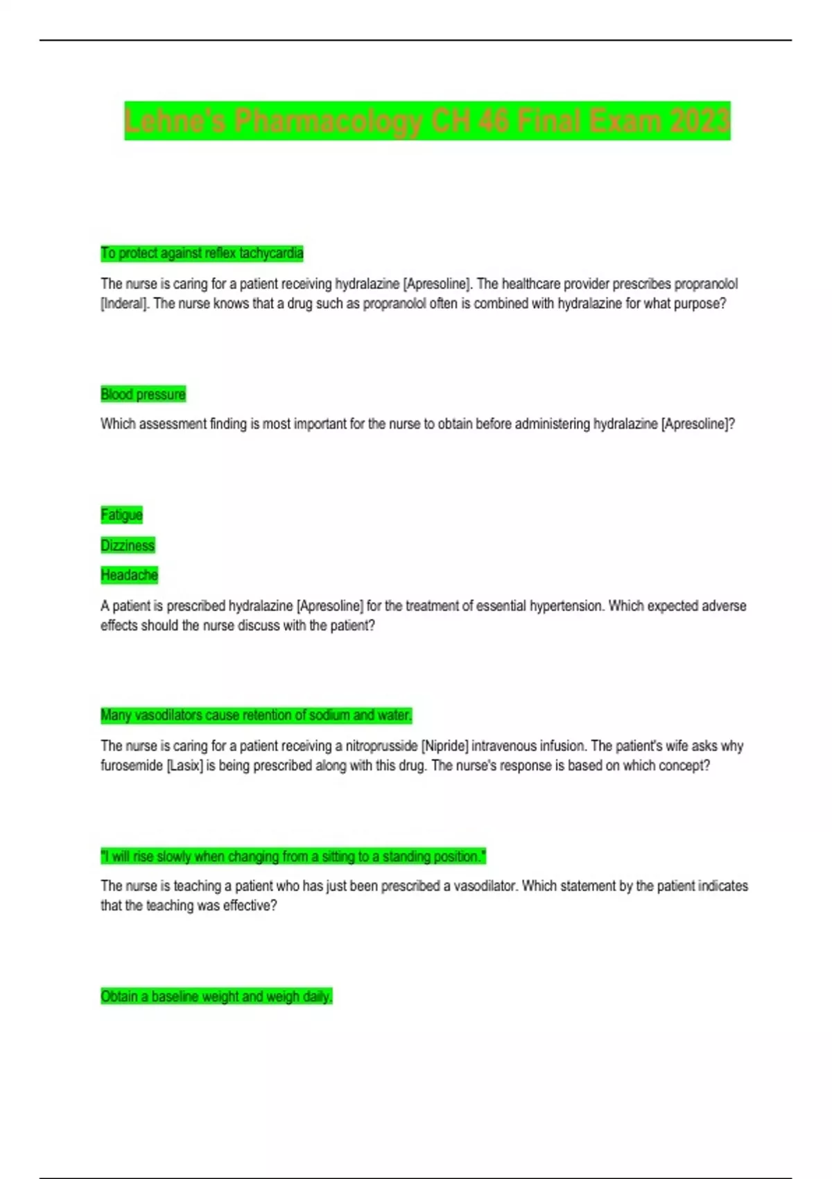 Lehne's Pharmacology CH 46 Final Exam 2023 To protect against reflex tachycardia The nurse is caring for a patient receiving hydralazine [Apresoline]. The healthcare provider prescribes propranolol [Inderal]. The nurse knows that a drug such as propranolol often is combined with hydralazine for what purpose? Blood pressure Which assessment finding is most important for the nurse to obtain before administering hydralazine [Apresoline]? Fatigue Dizziness Headache A patient is prescribed hydralazine [Apresoline] for the treatment of essential hypertension. Which expected adverse effects should the nurse discuss with the patient? Many vasodilators cause retention of sodium and water. The nurse is caring for a patient receiving a nitroprusside [Nipride] intravenous infusion. The patient's wife asks why furosemide [Lasix] is being prescribed along with this drug. The nurse's response is based on which concept? "I will rise slowly when changing from a sitting to a standing position." The nurse is teaching a patient who has just been prescribed a vasodilator. Which statement by the patient indicates that the teaching was effective? Obtain a baseline weight and weigh daily. Prepare for arterial line insertion. Cover the solution with an opaque bag. A patient in a hypertensive crisis is being started on a continuous sodium nitroprusside [Nipride] infusion. What interventions are essential before the nurse administers nitroprusside [Nipride]? Sudden confusion The nurse is caring for a patient who has been receiving intravenous sodium nitroprusside [Nitropress] for 3 days. Which assessement data indicate the patient may be experiencing thiocyanate toxicity? Adjust the intravenous infusion rate to the blood pressure response. The patient is admitted for the management of a hypertensive emergency. The healthcare provider prescribes sodium nitroprusside [Nipride] drug therapy. What is the priority nursing action during this treatment? Severe hypertension The nurse is preparing to administer minoxidil [Loniten] 5 mg orally. What is the only cardiovascular indication for this mediacation? Sodium nitroprusside [Nipride] A patient with hypertensive emergency is admitted to the hospital. Which medication should the nurse be prepared to administer to this patient? True (T/F) Hydralazine (Apresoline) reduces the work of the heart by reducing afterload False (T/F) Hydralazine (Apresoline) lowers blood pressure by causing vasodilation and diuresis False (T/F) An adverse effect of minoxidil is impairment in tissue perfusion True (T/F) The effects of an IV infusion of nitroprusside end within minutes of stopping the infusion False (T/F) Nitroglycerin is used to treat angina because it dilates arterioles in the heart, allowing more oxygen to get to heart muscle cells True (T/F) Orthostatic hypotension is more likely to occur when a patient is receiving a drug that dilates veins than one that dilates arterioles Fal