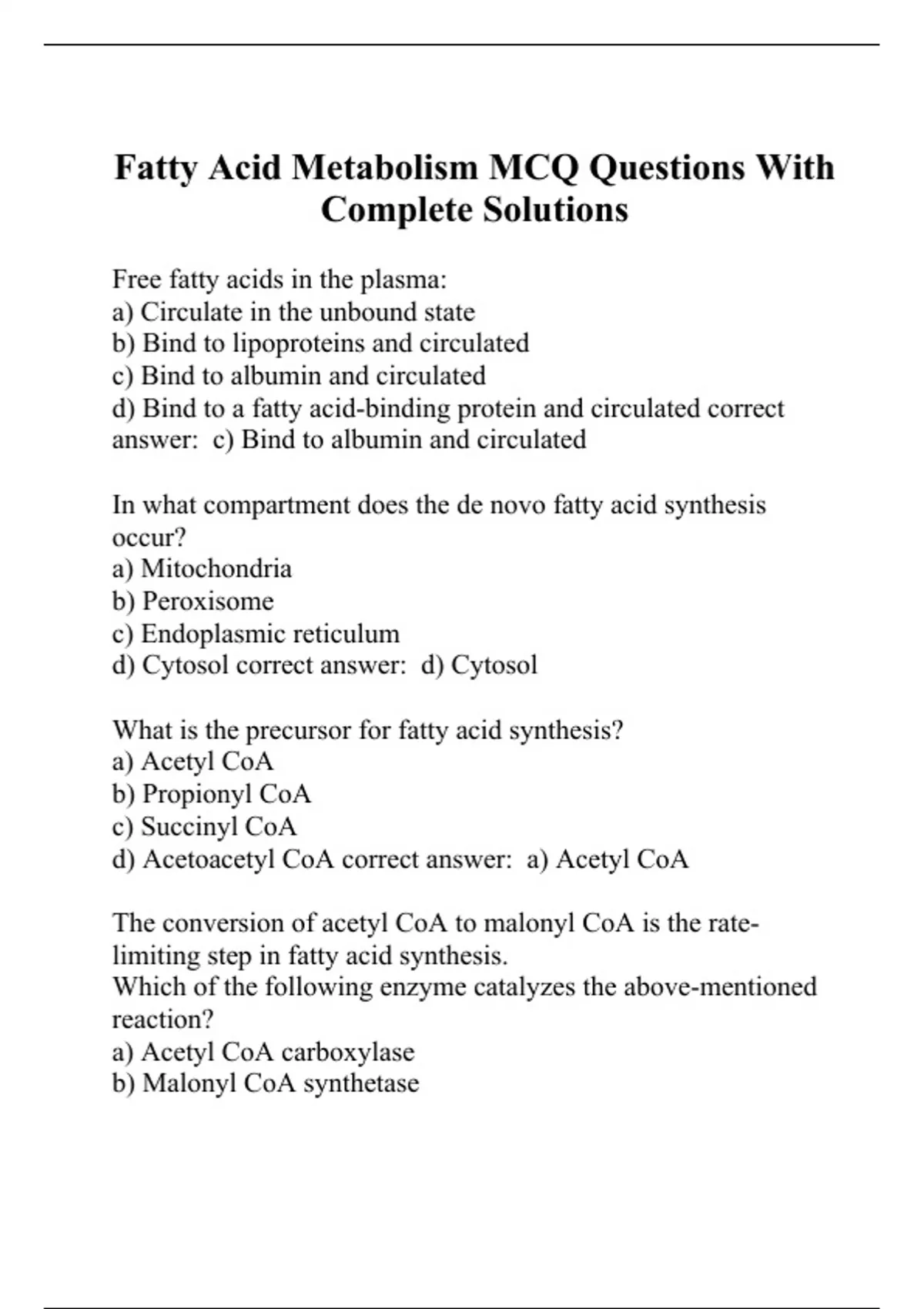 Fatty Acid Metabolism MCQ Questions With Complete Solutions