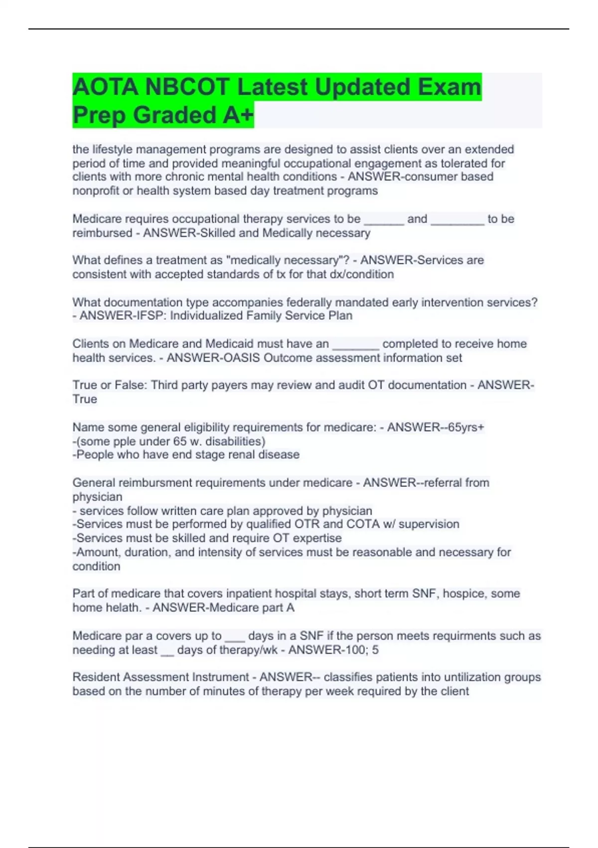 the lifestyle management programs are designed to assist clients over an extended period of time and provided meaningful occupational engagement as tolerated for clients with more chronic mental health conditions - ANSWER-consumer based nonprofit or health system based day treatment programs Medicare requires occupational therapy services to be ______ and ________ to be reimbursed - ANSWER-Skilled and Medically necessary What defines a treatment as "medically necessary"? - ANSWER-Services are consistent with accepted standards of tx for that dx/condition What documentation type accompanies federally mandated early intervention services? - ANSWER-IFSP: Individualized Family Service Plan Clients on Medicare and Medicaid must have an _______ completed to receive home health services. - ANSWER-OASIS Outcome assessment information set True or False: Third party payers may review and audit OT documentation - ANSWER-True Name some general eligibility requirements for medicare: - ANSWER--65yrs+ -(some pple under 65 w. disabilities) -People who have end stage renal disease General reimbursment requirements under medicare - ANSWER--referral from physician - services follow written care plan approved by physician -Services must be performed by qualified OTR and COTA w/ supervision -Services must be skilled and require OT expertise -Amount, duration, and intensity of services must be reasonable and necessary for condition Part of medicare that covers inpatient hospital stays, short term SNF, hospice, some home helath. - ANSWER-Medicare part A Medicare par a covers up to ___ days in a SNF if the person meets requirments such as needing at least __ days of therapy/wk - ANSWER-100; 5 Resident Assessment Instrument - ANSWER-- classifies patients into untilization groups based on the number of minutes of therapy per week required by the client