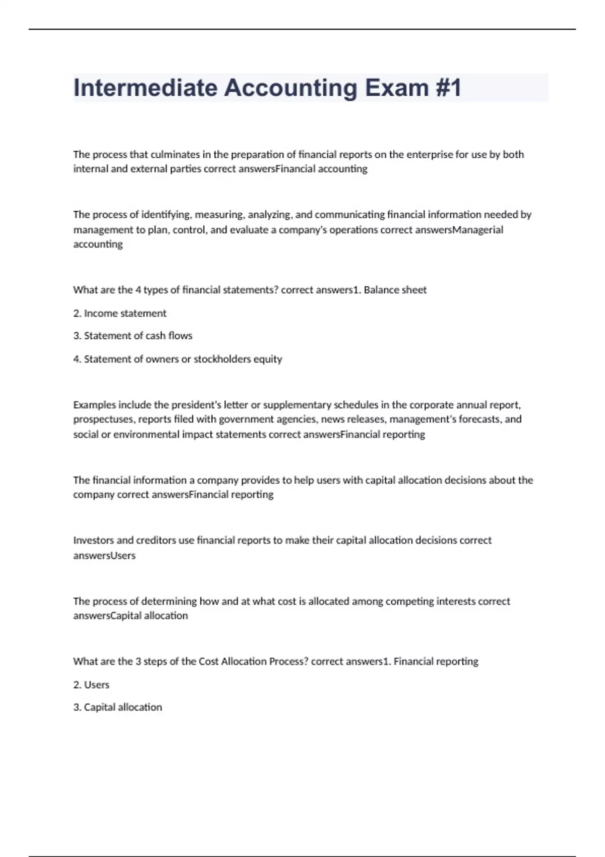 The process that culminates in the preparation of financial reports on the enterprise for use by both internal and external parties correct answersFinancial accounting The process of identifying, measuring, analyzing, and communicating financial information needed by management to plan, control, and evaluate a company's operations correct answersManagerial accounting What are the 4 types of financial statements? correct answers1. Balance sheet 2. Income statement 3. Statement of cash flows 4. Statement of owners or stockholders equity Examples include the president's letter or supplementary schedules in the corporate annual report, prospectuses, reports filed with government agencies, news releases, management's forecasts, and social or environmental impact statements correct answersFinancial reporting The financial information a company provides to help users with capital allocation decisions about the company correct answersFinancial reporting Investors and creditors use financial reports to make their capital allocation decisions correct answersUsers The process of determining how and at what cost is allocated among competing interests correct answersCapital allocation What are the 3 steps of the Cost Allocation Process? correct answers1. Financial reporting 2. Users 3. Capital allocation