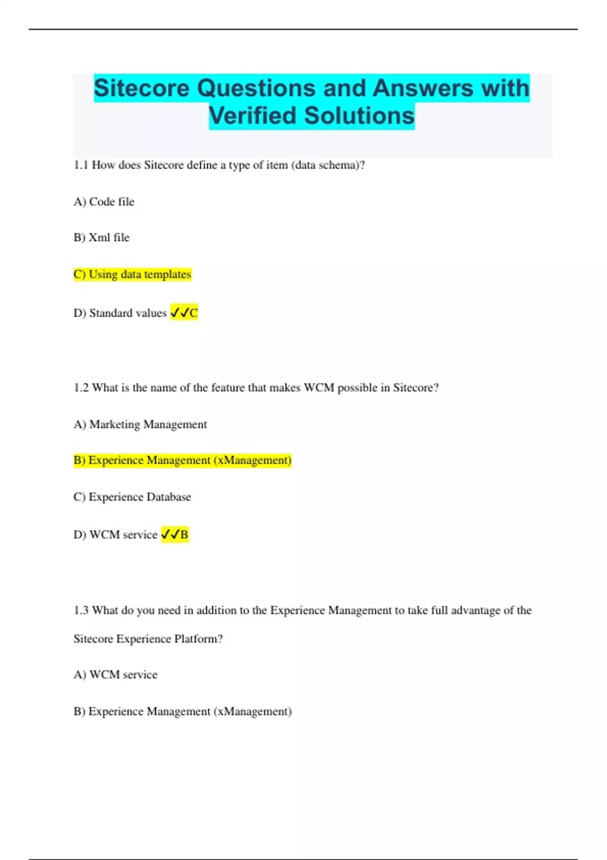 1.1 How does Sitecore define a type of item (data schema)? A) Code file B) Xml file C) Using data templates D) Standard values C 1.2 What is the name of the feature that makes WCM possible in Sitecore? A) Marketing Management B) Experience Management (xManagement) C) Experience Database D) WCM service B 1.3 What do you need in addition to the Experience Management to take full advantage of the Sitecore Experience Platform? A) WCM service B) Experience Management (xManagement)