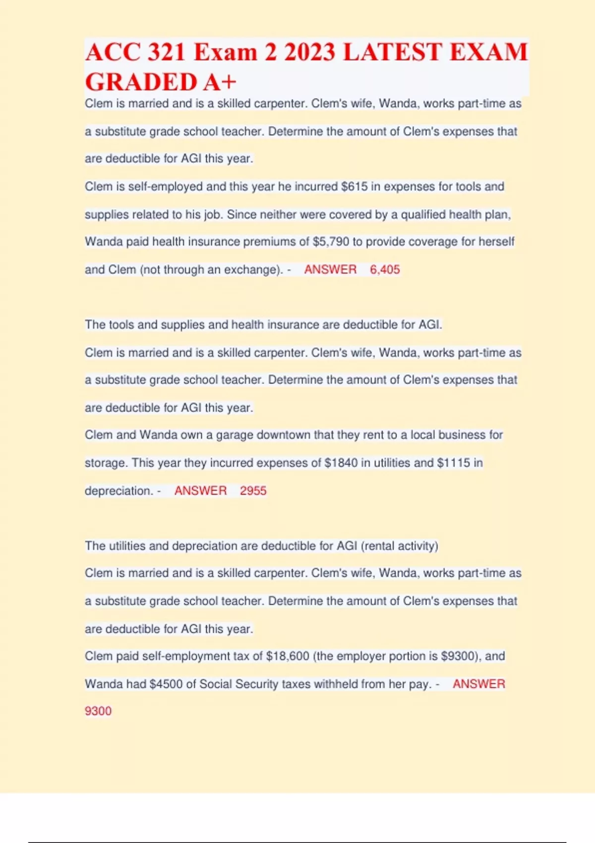 Clem is married and is a skilled carpenter. Clem's wife, Wanda, works part-time as a substitute grade school teacher. Determine the amount of Clem's expenses that are deductible for AGI this year. Clem is self-employed and this year he incurred $615 in expenses for tools and supplies related to his job. Since neither were covered by a qualified health plan, Wanda paid health insurance premiums of $5,790 to provide coverage for herself and Clem (not through an exchange). - ANSWER 6,405 The tools and supplies and health insurance are deductible for AGI. Clem is married and is a skilled carpenter. Clem's wife, Wanda, works part-time as a substitute grade school teacher. Determine the amount of Clem's expenses that are deductible for AGI this year. Clem and Wanda own a garage downtown that they rent to a local business for storage. This year they incurred expenses of $1840 in utilities and $1115 in depreciation. - ANSWER 2955 The utilities and depreciation are deductible for AGI (rental activity) Clem is married and is a skilled carpenter. Clem's wife, Wanda, works part-time as a substitute grade school teacher. Determine the amount of Clem's expenses that are deductible for AGI this year. Clem paid self-employment tax of $18,600 (the employer portion is $9300), and Wanda had $4500 of Social Security taxes withheld from her pay. - ANSWER 9300 The employer portion of the self-employment tax is deductible but for AGI but the Social Security tax is not deductible Smithers is a self-employed individual who earns $20,000
