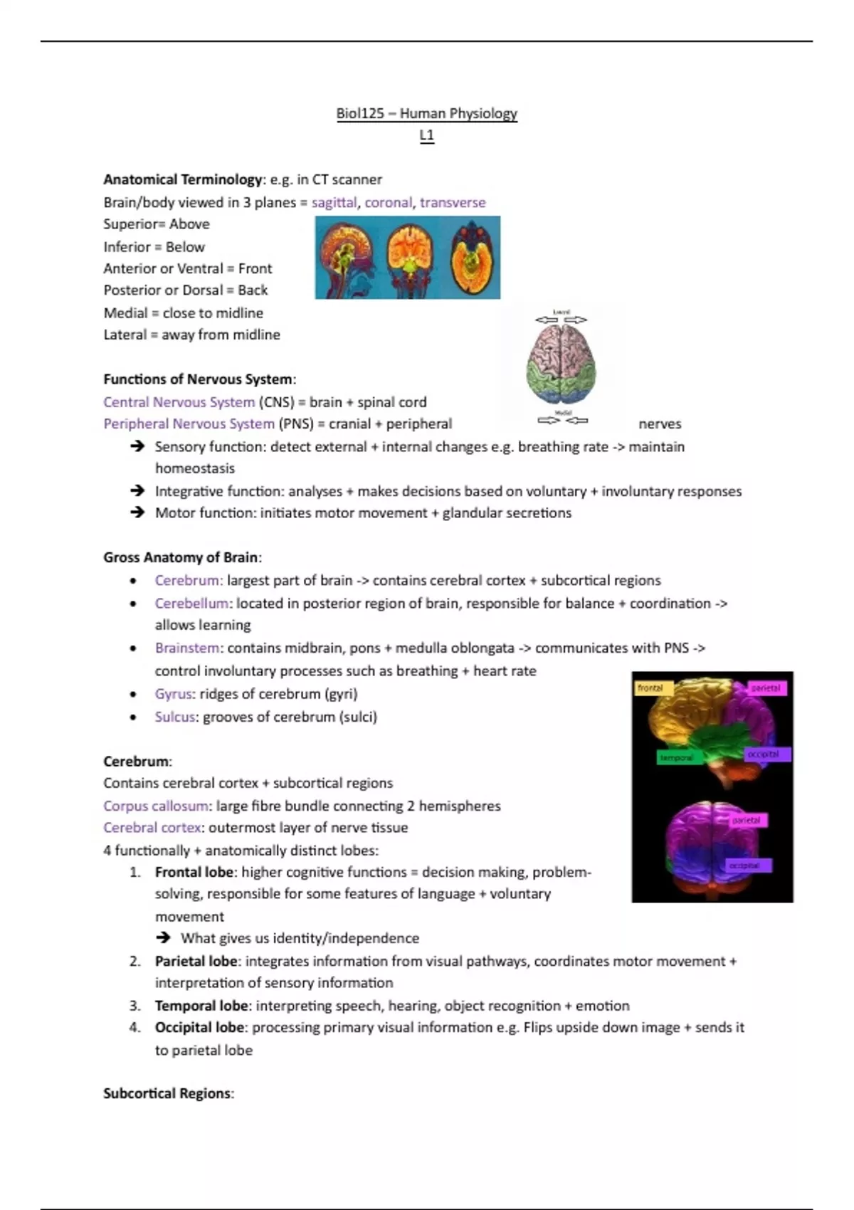 • Cerebrum: largest part of brain -> contains cerebral cortex + subcortical regions