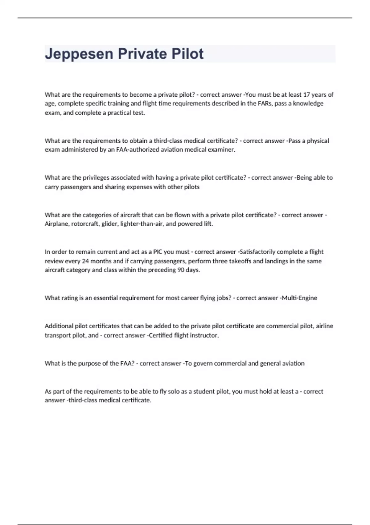 What are the requirements to become a private pilot? - correct answer -You must be at least 17 years of age, complete specific training and flight time requirements described in the FARs, pass a knowledge exam, and complete a practical test. What are the requirements to obtain a third-class medical certificate? - correct answer -Pass a physical exam administered by an FAA-authorized aviation medical examiner. What are the privileges associated with having a private pilot certificate? - correct answer -Being able to carry passengers and sharing expenses with other pilots What are the categories of aircraft that can be flown with a private pilot certificate? - correct answer -Airplane, rotorcraft, glider, lighter-than-air, and powered lift. In order to remain current and act as a PIC you must - correct answer -Satisfactorily complete a flight review every 24 months and if carrying passengers, perform three takeoffs and landings in the same aircraft category and class within the preceding 90 days. What rating is an essential requirement for most career flying jobs? - correct answer -Multi-Engine Additional pilot certificates that can be added to the private pilot certificate are commercial pilot, airline transport pilot, and - correct answer -Certified flight instructor. What is the purpose of the FAA? - correct answer -To govern commercial and general aviation As part of the requirements to be able to fly solo as a student pilot, you must hold at least a - correct answer -third-class medical certificate.