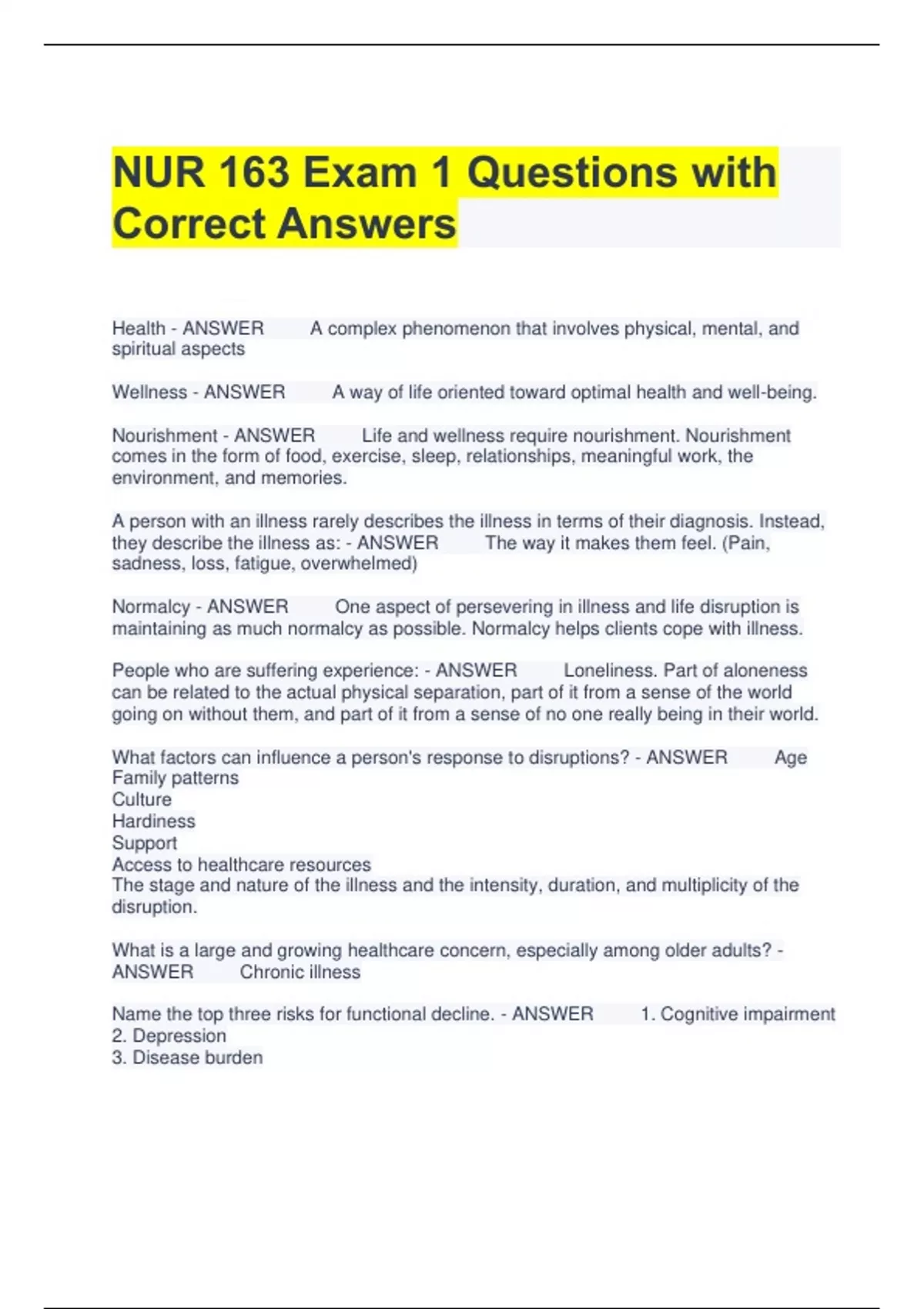NUR 163 Exam 1 Questions with Correct Answers Health - ANSWER A complex phenomenon that involves physical, mental, and spiritual aspects Wellness - ANSWER A way of life oriented toward optimal health and well-being. Nourishment - ANSWER Life and wellness require nourishment. Nourishment comes in the form of food, exercise, sleep, relationships, meaningful work, the environment, and memories. A person with an illness rarely describes the illness in terms of their diagnosis. Instead, they describe the illness as: - ANSWER The way it makes them feel. (Pain, sadness, loss, fatigue, overwhelmed) Normalcy - ANSWER One aspect of persevering in illness and life disruption is maintaining as much normalcy as possible. Normalcy helps clients cope with illness. People who are suffering experience: - ANSWER Loneliness. Part of aloneness can be related to the actual physical separation, part of it from a sense of the world going on without them, and part of it from a sense of no one really being in their world. What factors can influence a person's response to disruptions? - ANSWER Age Family patterns Culture Hardiness Support Access to healthcare resources The stage and nature of the illness and the intensity, duration, and multiplicity of the disruption. What is a large and growing healthcare concern, especially among older adults? - ANSWER Chronic illness Name the top three risks for functional decline. - ANSWER 1. Cognitive impairment 2. Depression 3. Disease burden What are some ways we can ease patients' disruptions as a result of admission, transfers, and discharge from a healthcare setting? - ANSWER Discharge planning, communication, coordination, and teaching. How does the World Health Organization define health? - ANSWER The World Health Organization (WHO) initially defined health as "a state of complete physical, mental and social well-being and not merely the absence of disease or infirmity" (WHO, 1948). In 1986 WHO redefined health as "a resource for everyday life, not the objective of living. Health is a positive concept emphasizing social and personal resources, as well as physical capacities".