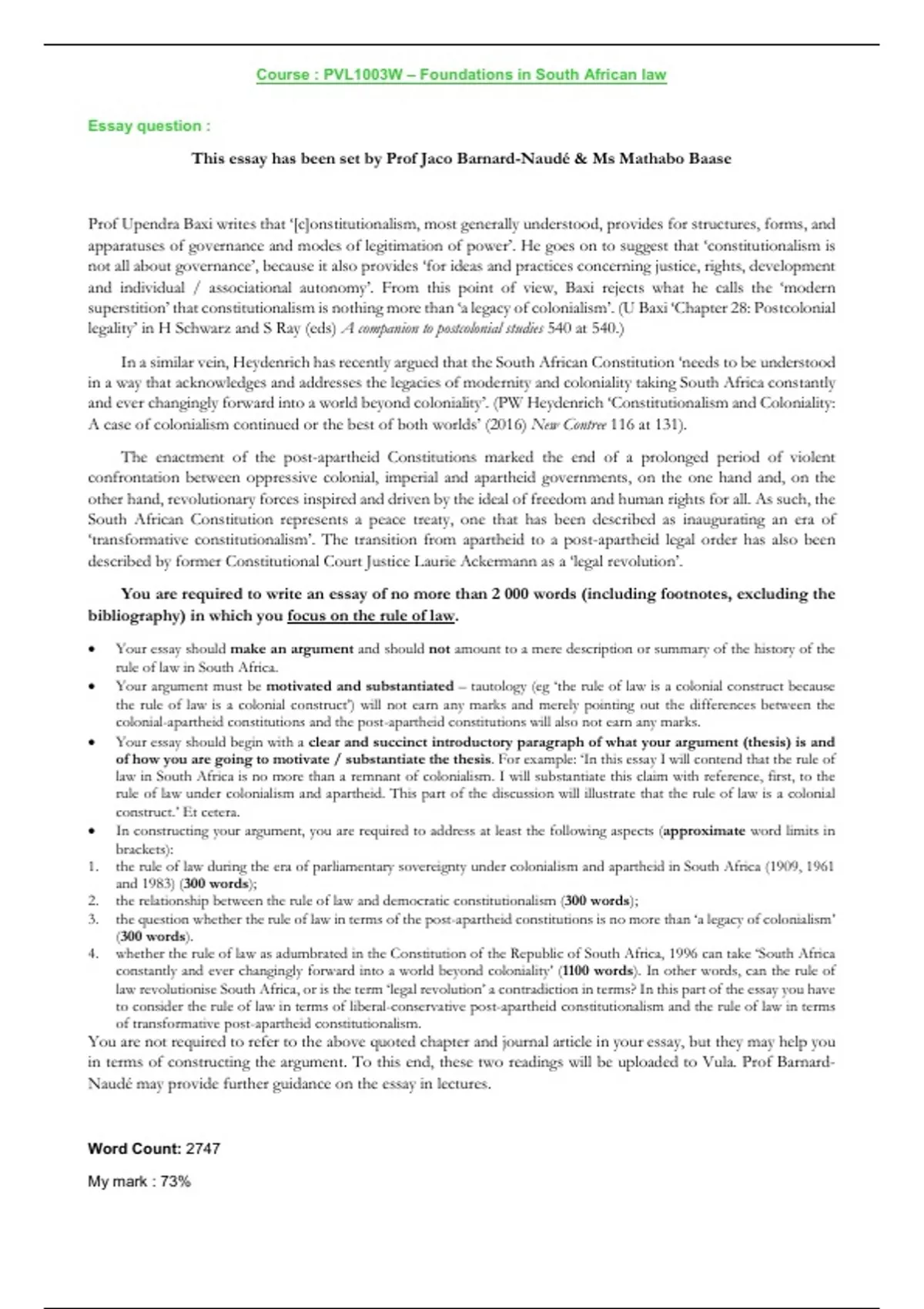 This essay has been set by Prof Jaco Barnard-Naudé & Ms Mathabo Baase