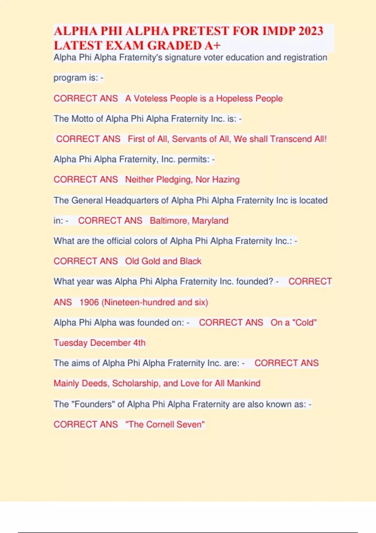 Alpha Phi Alpha Fraternity's signature voter education and registration program is: - CORRECT ANS A Voteless People is a Hopeless People The Motto of Alpha Phi Alpha Fraternity Inc. is: - CORRECT ANS First of All, Servants of All, We shall Transcend All! Alpha Phi Alpha Fraternity, Inc. permits: - CORRECT ANS Neither Pledging, Nor Hazing The General Headquarters of Alpha Phi Alpha Fraternity Inc is located in: - CORRECT ANS Baltimore, Maryland What are the official colors of Alpha Phi Alpha Fraternity Inc.: - CORRECT ANS Old Gold and Black What year was Alpha Phi Alpha Fraternity Inc. founded? - CORRECT