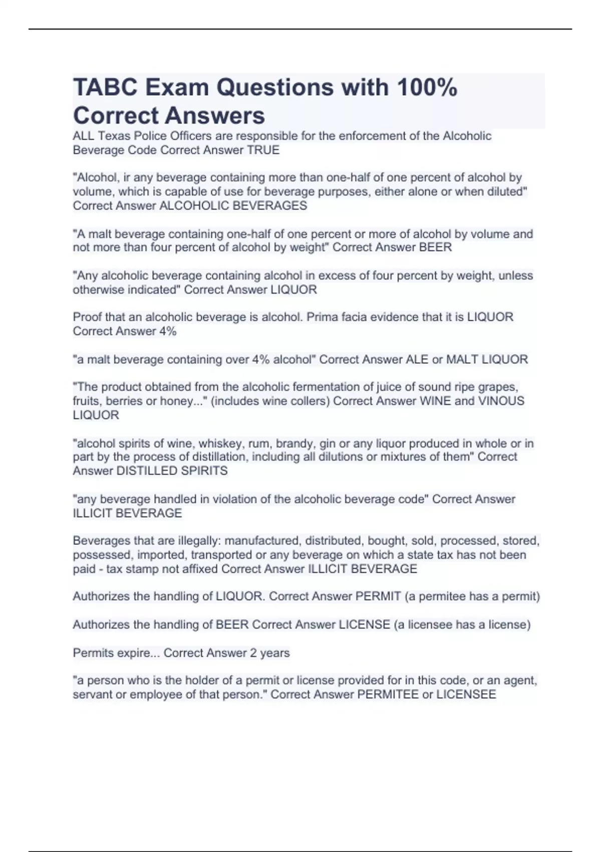 ALL Texas Police Officers are responsible for the enforcement of the Alcoholic Beverage Code Correct Answer TRUE "Alcohol, ir any beverage containing more than one-half of one percent of alcohol by volume, which is capable of use for beverage purposes, either alone or when diluted" Correct Answer ALCOHOLIC BEVERAGES "A malt beverage containing one-half of one percent or more of alcohol by volume and not more than four percent of alcohol by weight" Correct Answer BEER "Any alcoholic beverage containing alcohol in excess of four percent by weight, unless otherwise indicated" Correct Answer LIQUOR Proof that an alcoholic beverage is alcohol. Prima facia evidence that it is LIQUOR Correct Answer 4% "a malt beverage containing over 4% alcohol" Correct Answer ALE or MALT LIQUOR "The product obtained from the alcoholic fermentation of juice of sound ripe grapes, fruits, berries or honey..." (includes wine collers) Correct Answer WINE and VINOUS LIQUOR "alcohol spirits of wine, whiskey, rum, brandy, gin or any liquor produced in whole or in part by the process of distillation, including all dilutions or mixtures of them" Correct Answer DISTILLED SPIRITS "any beverage handled in violation of the alcoholic beverage code" Correct Answer ILLICIT BEVERAGE Beverages that are illegally: manufactured, distributed, bought, sold, processed, stored, possessed, imported, transported or any beverage on which a state tax has not been paid - tax stamp not affixed Correct Answer ILLICIT BEVERAGE