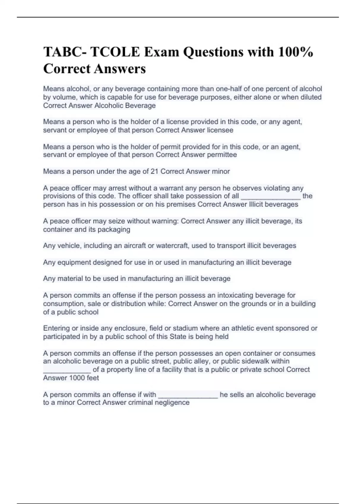 TABC- TCOLE Exam Questions with 100% Correct Answers
