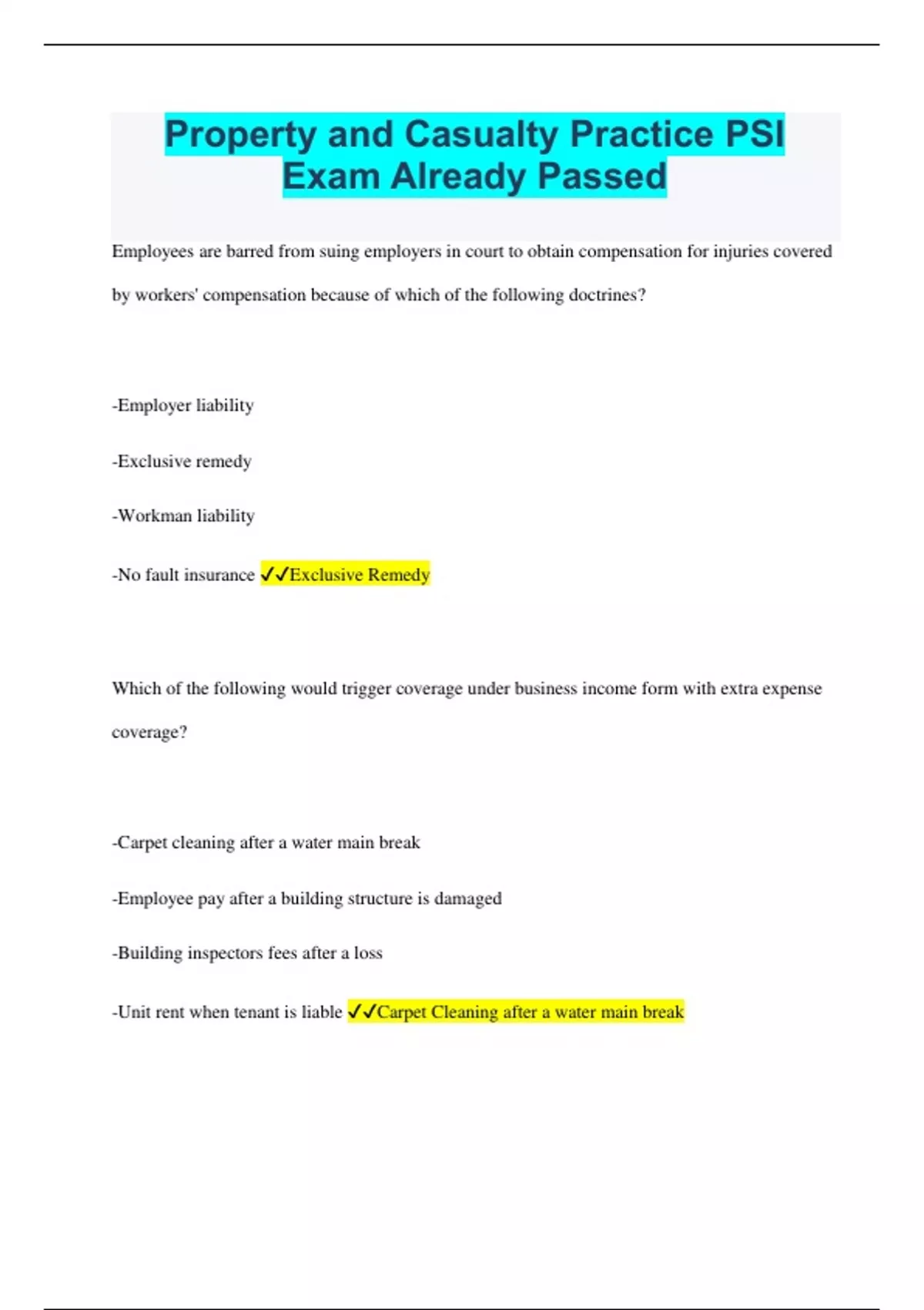 Employees are barred from suing employers in court to obtain compensation for injuries covered by workers' compensation because of which of the following doctrines? -Employer liability -Exclusive remedy -Workman liability -No fault insurance Exclusive Remedy Which of the following would trigger coverage under business income form with extra expense coverage? -Carpet cleaning after a water main break -Employee pay after a building structure is damaged -Building inspectors fees after a loss -Unit rent when tenant is liable Carpet Cleaning after a water main break