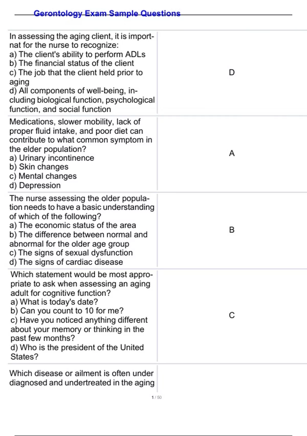In assessing the aging client, it is import- nat for the nurse to recognize: a) The client's ability to perform ADLs b) The financial status of the client c) The job that the client held prior to D aging d) All components of well-being, in- cluding biological function, psychological function, and social function Medications, slower mobility, lack of proper fluid intake, and poor diet can contribute to what common symptom in the elder population? a) Urinary incontinence b) Skin changes c) Mental changes d) Depression The nurse assessing the older population needs to have a basic understanding of which of the following? a) The economic status of the area b) The difference between normal and abnormal for the older age group c) The signs of sexual dysfunction d) The signs of cardiac disease Which statement would be most appro- priate to ask when assessing an aging adult for cognitive function? a) What is today's date? b) Can you count to 10 for me? c) Have you noticed anything different about your memory or thinking in the past few months? d) Who is the president of the United States? Which disease or ailment is often under diagnosed and undertreated in the aging A B C Gerontology Exam Sample Questions 2 / 50 population? a) Schizpphrenia b) Depression B c) Associative disorders d) Attention deficit disorder Which statement demonstrates normal cognitive function for an aging adult? a) Occasional memory lapses b) Unable to recall the names of their children or siblings A c) Unable to recall current address or phone number d) Unable to count to 10 or repeat a series of consecutive numbers Denmentia and depression are strongly related to: a) Clients over the age of 60 b) Clients over the age of 65 c) A decreased quality of life and functional deficits d) Past economic status and job perfor- mance Which statement reflects the state of drug absorption in the geriatric patient? a) The rate of absorption is slowed b) The rate of absorption is faster due to thinning of the mucosa A c) The percentage of the medication that is absorbed is decreased d) There is a decrease in gastric pH as we age The absorption of medication in the geri- atric client is most often affected by: a) A decrease in body fat b) An increase in serun albumin C c) A decrease in body water and lean body weight