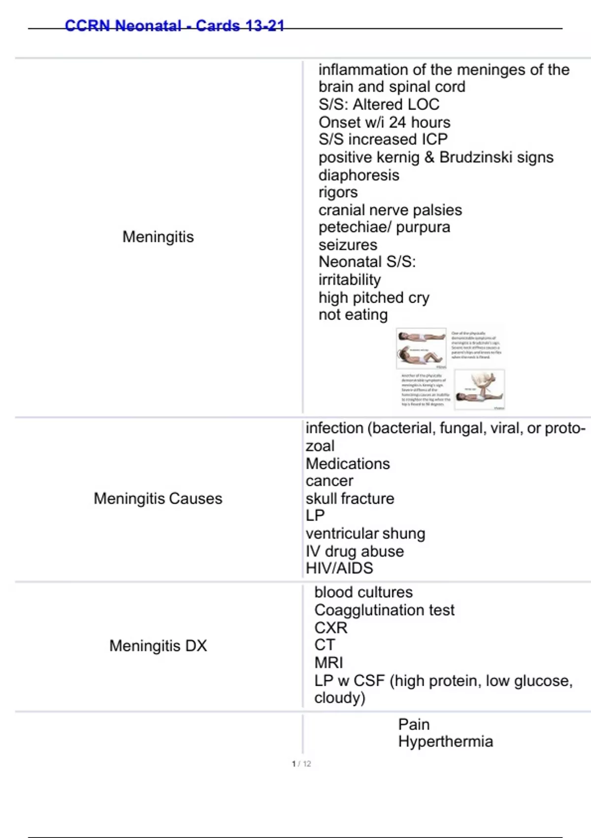 Meningitis inflammation of the meninges of the brain and spinal cord S/S: Altered LOC Onset w/i 24 hours S/S increased ICP positive kernig & Brudzinski signs diaphoresis rigors cranial nerve palsies petechiae/ purpura seizures Neonatal S/S: irritability high pitched cry not eating Meningitis Causes Meningitis DX infection (bacterial, fungal, viral, or proto- zoal Medications cancer skull fracture LP ventricular shung IV drug abuse HIV/AIDS blood cultures Coagglutination test CXR CT MRI LP w CSF (high protein, low glucose, cloudy) Pain Hyperthermia