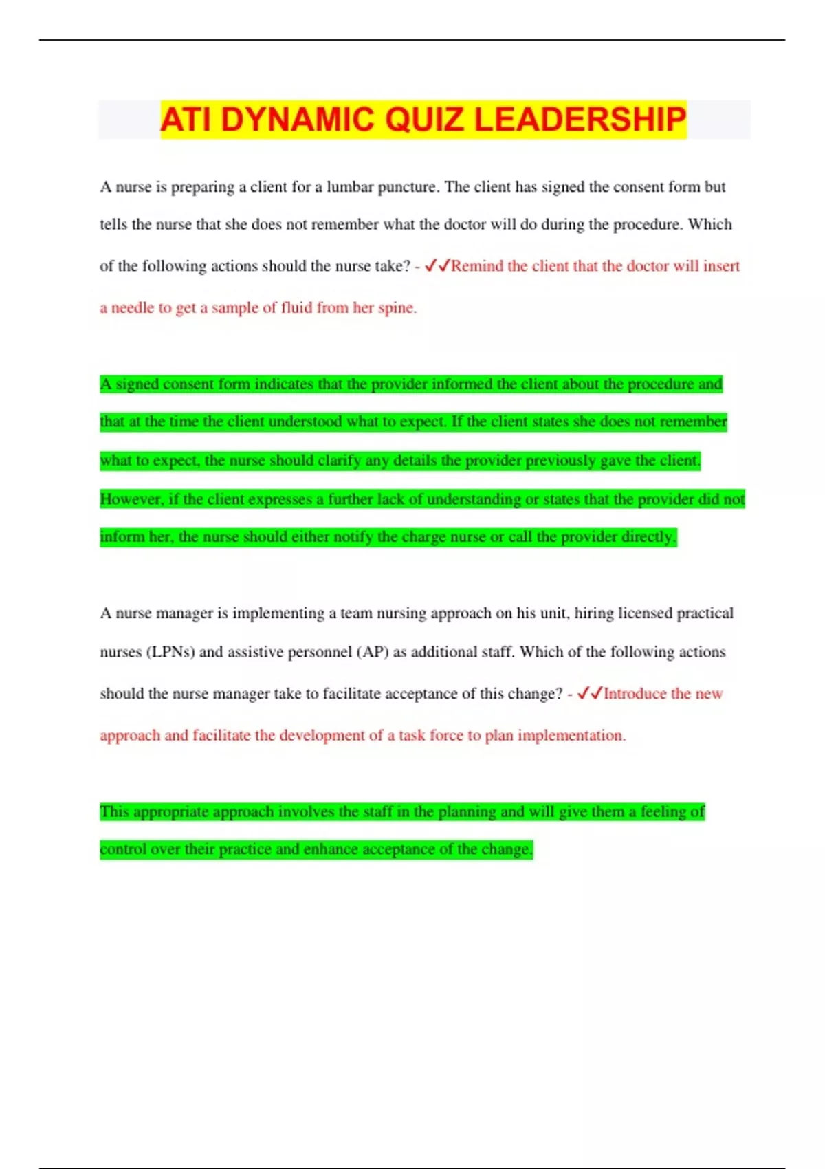 A nurse is preparing a client for a lumbar puncture. The client has signed the consent form but tells the nurse that she does not remember what the doctor will do during the procedure. Which of the following actions should the nurse take? - Remind the client that the doctor will insert a needle to get a sample of fluid from her spine. A signed consent form indicates that the provider informed the client about the procedure and that at the time the client understood what to expect. If the client states she does not remember what to expect, the nurse should clarify any details the provider previously gave the client. However, if the client expresses a further lack of understanding or states that the provider did not inform her, the nurse should either notify the charge nurse or call the provider directly. A nurse manager is implementing a team nursing approach on his unit, hiring licensed practical nurses (LPNs) and assistive personnel (AP) as additional staff. Which of the following actions should the nurse manager take to facilitate acceptance of this change? - Introduce the new approach and facilitate the development of a task force to plan implementation. This appropriate approach involves the staff in the planning and will give them a feeling of control over their practice and enhance acceptance of the change.A group of providers is participating in a resuscitation effort for a client who is in cardiac arrest. Which of the following types of leadership is required for this group to function most efficiently? - Autocratic Autocratic leadership is most effective in an emergency situation. An autocratic leader will direct and issues commands that are necessary for successful cardiopulmonary resuscitation. A nurse is having difficulty completing care and documentation without staying past the end of the shift. The nurse manager suggests focusing on time-management skills. Which of the following strategies should the nurse plan to use? - Identify tasks in order of their priority. Prioritizing is an important time-management strategy. The nurse should prioritize each client's needs and tasks and attend to the highest priority client first