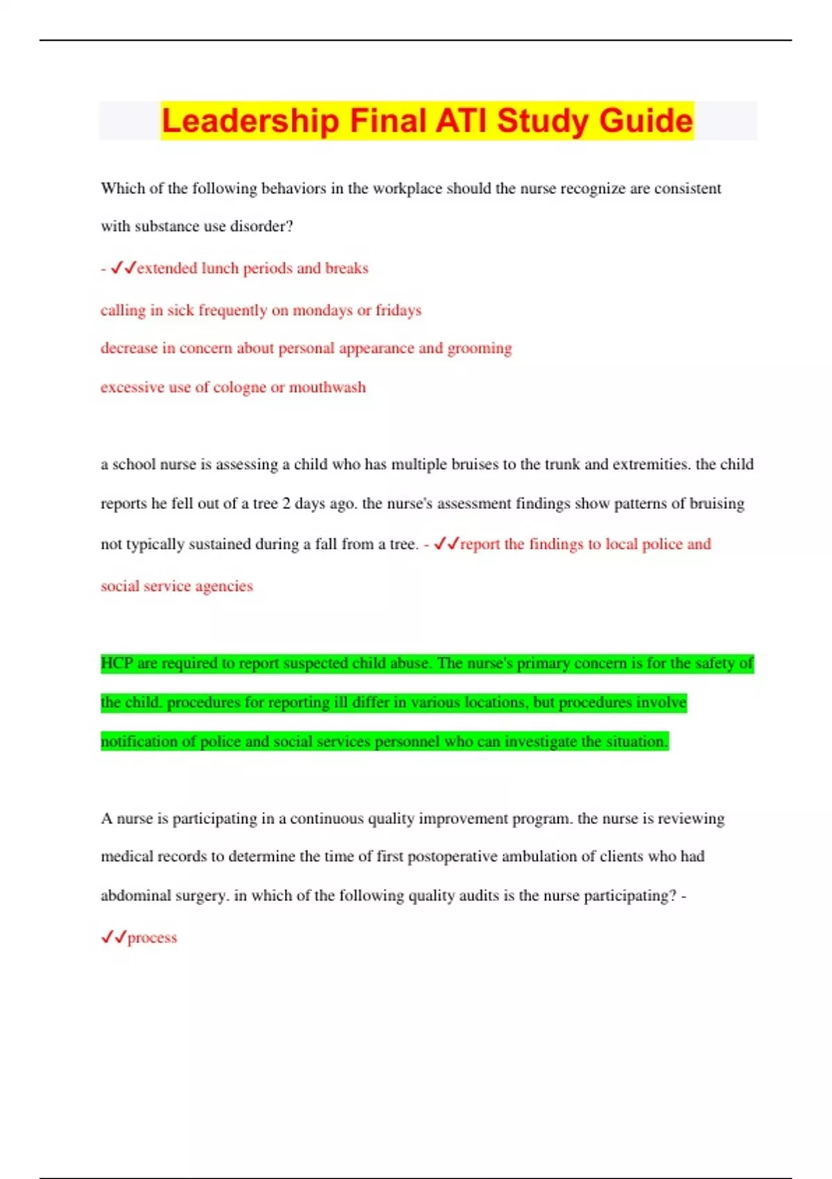 Which of the following behaviors in the workplace should the nurse recognize are consistent with substance use disorder? - extended lunch periods and breaks calling in sick frequently on mondays or fridays decrease in concern about personal appearance and grooming excessive use of cologne or mouthwash a school nurse is assessing a child who has multiple bruises to the trunk and extremities. the child reports he fell out of a tree 2 days ago. the nurse's assessment findings show patterns of bruising not typically sustained during a fall from a tree. - report the findings to local police and social service agencies HCP are required to report suspected child abuse. The nurse's primary concern is for the safety of the child. procedures for reporting ill differ in various locations, but procedures involve notification of police and social services personnel who can investigate the situation. A nurse is participating in a continuous quality improvement program. the nurse is reviewing medical records to determine the time of first postoperative ambulation of clients who had abdominal surgery. in which of the following quality audits is the nurse participating? - process