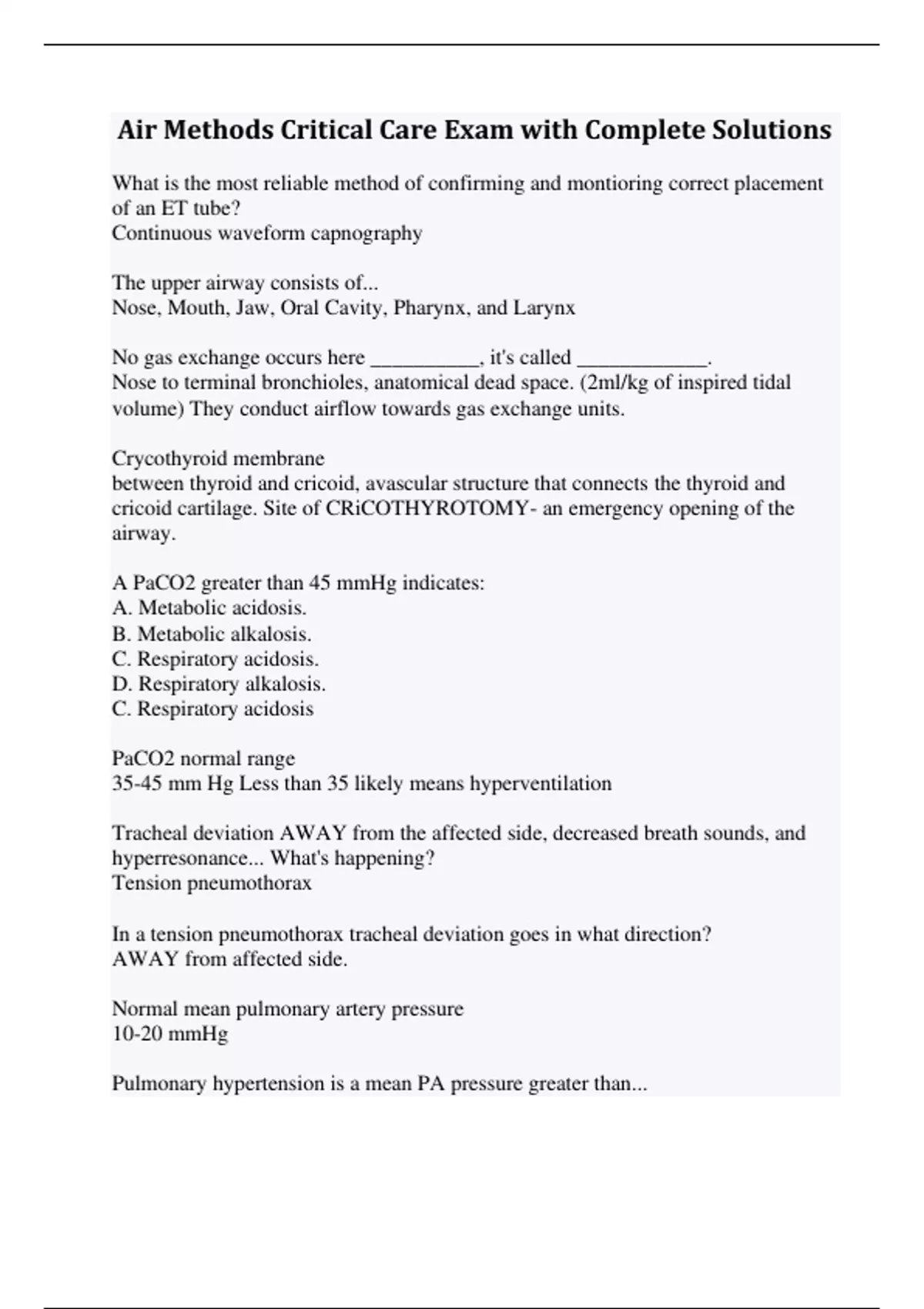 What is the most reliable method of confirming and montioring correct placement of an ET tube? Continuous waveform capnography The upper airway consists of... Nose, Mouth, Jaw, Oral Cavity, Pharynx, and Larynx No gas exchange occurs here __________, it's called ____________. Nose to terminal bronchioles, anatomical dead space. (2ml/kg of inspired tidal volume) They conduct airflow towards gas exchange units. Crycothyroid membrane between thyroid and cricoid, avascular structure that connects the thyroid and cricoid cartilage. Site of CRiCOTHYROTOMY- an emergency opening of the airway. A PaCO2 greater than 45 mmHg indicates: A. Metabolic acidosis. B. Metabolic alkalosis. C. Respiratory acidosis. D. Respiratory alkalosis. C. Respiratory acidosis PaCO2 normal range 35-45 mm Hg Less than 35 likely means hyperventilation Tracheal deviation AWAY from the affected side, decreased breath sounds, and hyperresonance... What's happening? Tension pneumothorax In a tension pneumothorax tracheal deviation goes in what direction? AWAY from affected side. Normal mean pulmonary artery pressure 10-20 mmHg Pulmonary hypertension is a mean PA pressure greater than... (PAm) greater than 20 Primary pulmonary hypertension Idiopathic genetic disorder caused by abnormal structure of the pulmonary blood vessels Name three causes of secondary pulmonary hypertension.. 1. Passive PH- the result of back pressure. Mitral Stenosis, LV systolic failure. 2. Active PH- Constriction of the pulmonary circuit Increased volume in pulmonary circuit (i.e. congenital heart disease) 3. Obstruction as in Chronic recurrent PE TNP of the Pregnant patient Resuscitation priorities are the same. The best way to take care of the baby is to take care of mama Mechanisms of injury and biomechanics the most common cause of maternal injury is... Blunt trauma caused by MVC. Second is BT caused by falls, 3rd is violence fetal distress is an early sign of maternal distress... Why? Catecholamine mediated vasoconstriction resulting from blood loss shunts blood away from the fetus to the mom. Fetal hypo perfusion is evidenced by.... Fetal tachycardia (140 to 160+) and fetal bradycardia The FRC in a pregnant patient is.... Reduced by the gravid uterus lifting the diaphragm. chest tube placement in a pregnant patient is 1-2 spaces higher Because of the lifted diaphragm What is the cause of physiological anemia in pregnant patients? Hemodilitional anemia occurs. Plasma volume increases 30-50%. Preterm Labor (PTL) abruptio placentae premature separation of the placenta from the uterine wall
