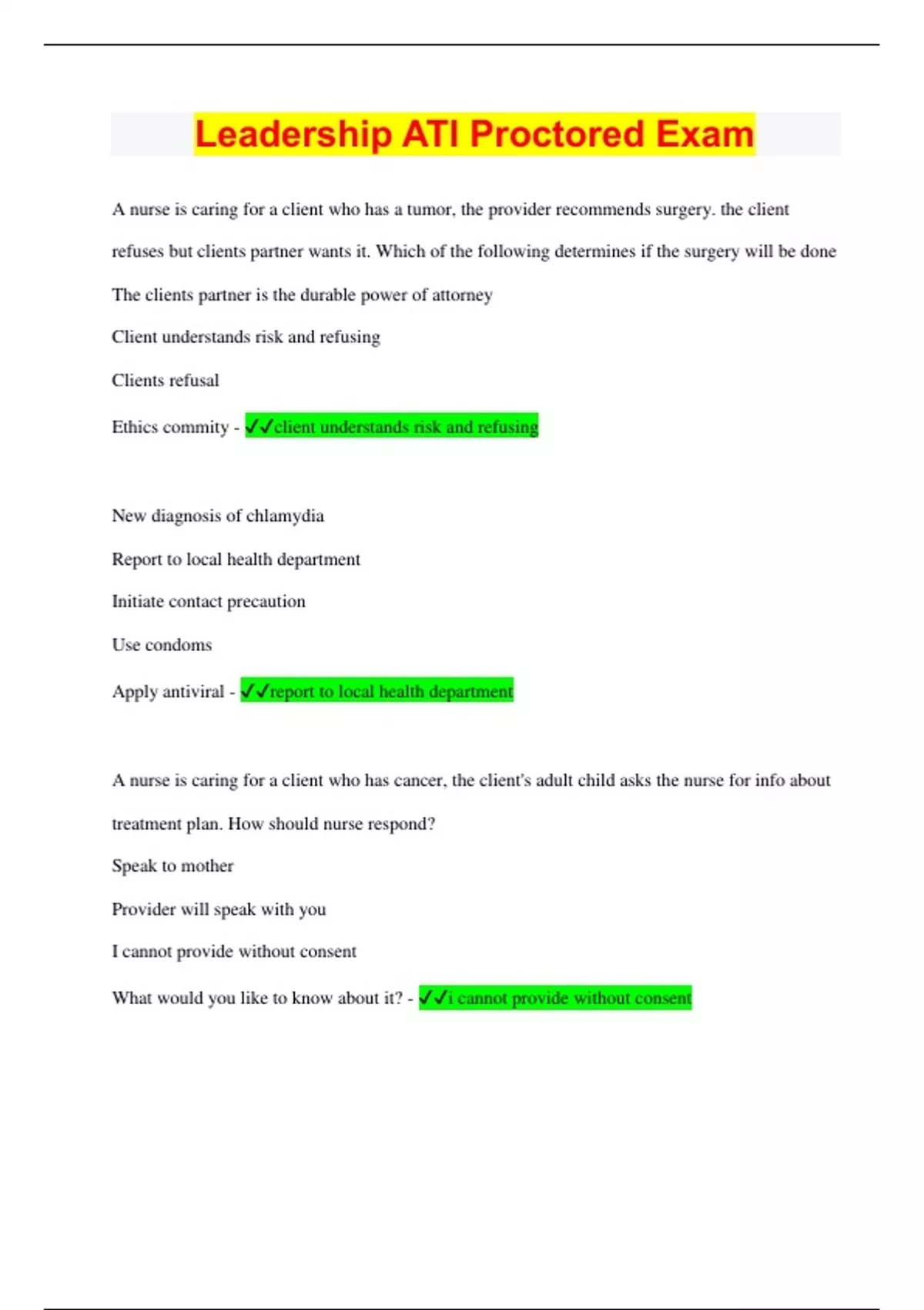 A nurse is caring for a client who has a tumor, the provider recommends surgery. the client refuses but clients partner wants it. Which of the following determines if the surgery will be done The clients partner is the durable power of attorney Client understands risk and refusing Clients refusal Ethics commity - client understands risk and refusing New diagnosis of chlamydia Report to local health department Initiate contact precaution Use condoms Apply antiviral - report to local health department A nurse is caring for a client who has cancer, the client's adult child asks the nurse for info about treatment plan. How should nurse respond? Speak to mother Provider will speak with you I cannot provide without consent What would you like to know about it? - i cannot provide without consent
