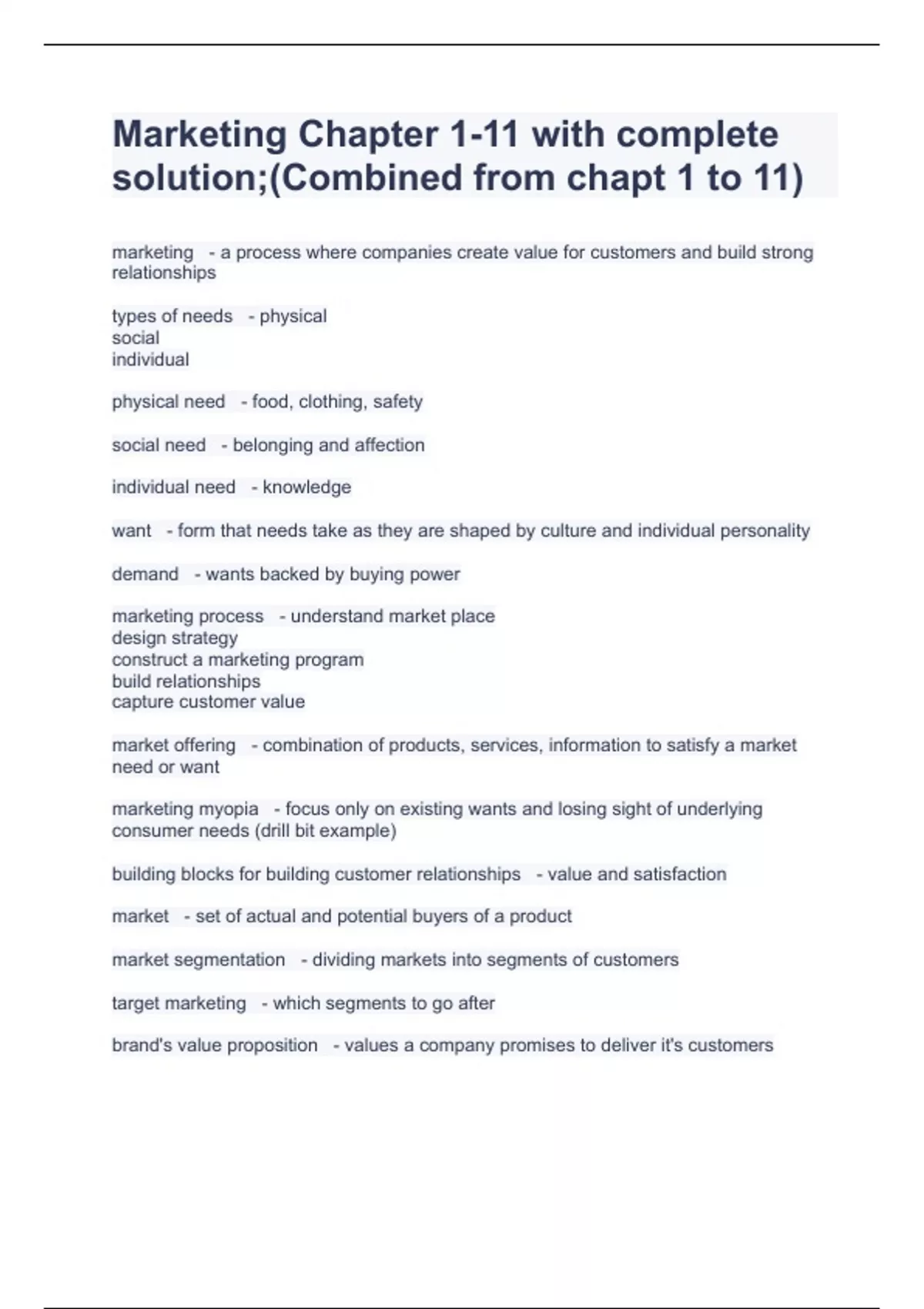 Marketing Chapter 1-11 with complete solution;(Combined from chapt 1 to 11)