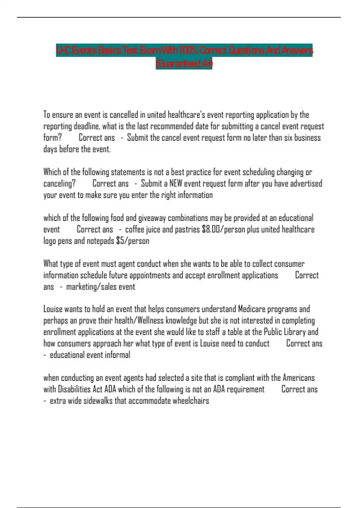 UHC Events Basics Test Exam With 100% Correct Questions And Answers (Guaranteed A+) To ensure an event is cancelled in united healthcare's event reporting application by the reporting deadline, what is the last recommended date for submitting a cancel event request form? Correct ans - Submit the cancel event request form no later than six business days before the event. Which of the following statements is not a best practice for event scheduling changing or canceling? Correct ans - Submit a NEW event request form after you have advertised your event to make sure you enter the right information which of the following food and giveaway combinations may be provided at an educational event Correct ans - coffee juice and pastries $8.00/person plus united healthcare logo pens and notepads $5/person What type of event must agent conduct when she wants to be able to collect consumer information schedule future appointments and accept enrollment applications Correct ans - marketing/sales event Louise wants to hold an event that helps consumers understand Medicare programs and perhaps an prove their health/Wellness knowledge but she is not interested in completing enrollment applications at the event she would like to staff a table at the Public Library and how consumers approach her what type of event is Louise need to conduct Correct ans - educational event informal when conducting an event agents had selected a site that is compliant with the Americans with Disabilities Act ADA which of the following is not an ADA requirement Correct ans - extra wide sidewalks that accommodate wheelchairs which of the following elements does not need to be entered on the new event request form when reporting a new event Correct ans - the event venue manager/contact person Which of the following statements regarding united healthcare's event cancellation reporting rules is true Correct ans - event cancellation must be reported in united healthcare's event reporting application at least one business day prior to the event except in the case of inclement weather