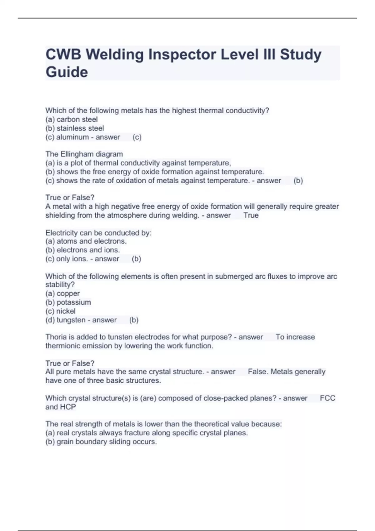 CWB Welding Inspector Level III Study Guide Questions with correct Answers