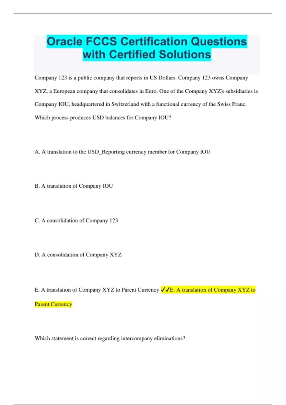 Company 123 is a public company that reports in US Dollars. Company 123 owns Company XYZ, a European company that consolidates in Euro. One of the Company XYZ's subsidiaries is Company IOU, headquartered in Switzerland with a functional currency of the Swiss Franc. Which process produces USD balances for Company IOU? A. A translation to the USD_Reporting currency member for Company IOU B. A translation of Company IOU C. A consolidation of Company 123 D. A consolidation of Company XYZ E. A translation of Company XYZ to Parent Currency E. A translation of Company XYZ to Parent Currency