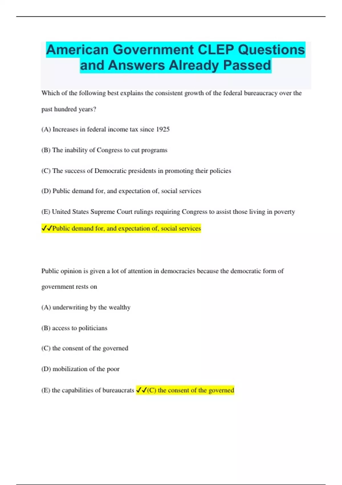 American Government CLEP Questions and Answers Already Passed Which of the following best explains the consistent growth of the federal bureaucracy over the past hundred years? (A) Increases in federal income tax since 1925 (B) The inability of Congress to cut programs (C) The success of Democratic presidents in promoting their policies (D) Public demand for, and expectation of, social services (E) United States Supreme Court rulings requiring Congress to assist those living in poverty Public demand for, and expectation of, social services Public opinion is given a lot of attention in democracies because the democratic form of government rests on (A) underwriting by the wealthy (B) access to politicians (C) the consent of the governed (D) mobilization of the poor (E) the capabilities of bureaucrats (C) the consent of the governed 3. An oral statement that is false and intended to damage an individual is known as (A) slander (B) libel (C) testimony (D) argument (E) free speech (A) slander 4. Which of the following is clearly a task charged to the Federal Reserve as a regulatory agency? (A) Protecting market users and the public from fraud, manipulation and abusive practices related to the sale of commodity and financial futures and options (B) Eliminating and preventing what regulators perceive to be harmfully anticompetitive business practices, such as coercive monopolies (C) Disclosing campaign-finance information and overseeing the public funding of presidential elections (D) Developing government-wide, cost-minimizing policies and offering superior workplaces, expert solutions, acquisition services and management policies (E) Providing financial services to depository institutions, the United States government and foreign institutions, as well as playing a key role in operating the nation's payments system (E) Providing financial services to depository institutions, the United States government and foreign institutions, as well as playing a key role in operating the nation's payments system Although the Constitution does not explicitly give Congress the right to enact a military draft, which clause in the Constitution allows Congress to do so? (A) Necessary and proper clause (B) Take care clause (C) Taxing and spending clause (D) Due process clause of the Fourteenth Amendment (E) Equal protection clause of the Fourteenth Amendment (A) Necessary and proper clause The formation of numerous interest groups during the post-Civil War industrialization shows the (A) influence of debates about slavery on the public (B) growing influence of women's rights groups (C) minimal influence of the federal government on group formation (D) influence of social tensions and economic stress on group formation (E) shift in federal government funding for interest groups (D) influence of social tensions and economic stress on group formation Which of the following statements best reflects the pluralist theory of American politics? (A) American politics is dominated by a small elite. (B) Public policies emerge from cooperation among elites in business, labor, and government. (C) Public policies emerge from compromises reached among competing groups. (D) American politics is dominated by cities at the expense of rural areas. (E) The American political arena is made up of isolated individuals who have few group affiliations outside the family. (C) Public policies emerge from compromises reached among competing groups. Which of the following is generally the most significant influence on an individual's identification with a particular political party? (A) Religious affiliation (B) Family (C) Level of education (D) Television (E) The party identification of the incumbent president (B) Family . Which of the following committee assignments would