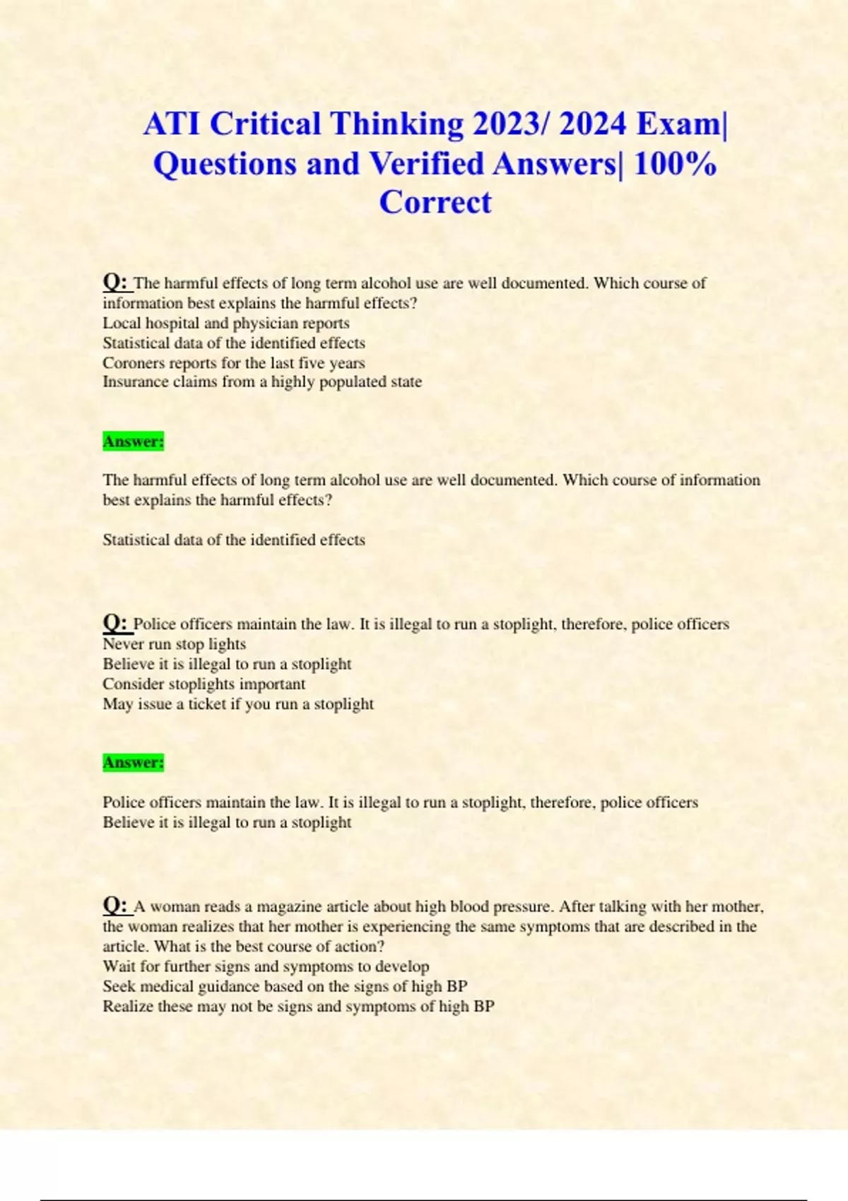 ATI Critical Thinking 2023/ 2024 Exam| Questions and Verified Answers| 100% Correct