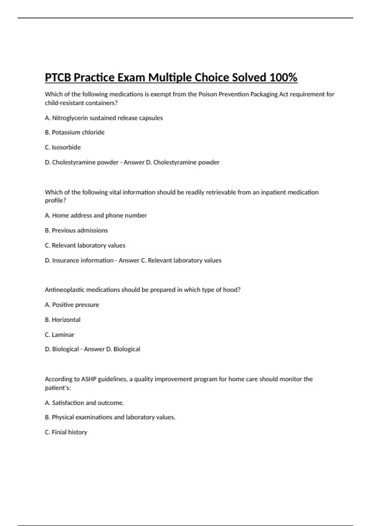 Which of the following medications is exempt from the Poison Prevention Packaging Act requirement for child-resistant containers? A. Nitroglycerin sustained release capsules B. Potassium chloride C. Isosorbide D. Cholestyramine powder - Answer D. Cholestyramine powder Which of the following vital information should be readily retrievable from an inpatient medication profile? A. Home address and phone number B. Previous admissions C. Relevant laboratory values D. Insurance information - Answer C. Relevant laboratory values Antineoplastic medications should be prepared in which type of hood? A. Positive pressure B. Horizontal C. Laminar D. Biological - Answer D. Biological According to ASHP guidelines, a quality improvement program for home care should monitor the patient's: A. Satisfaction and outcome. B. Physical examinations and laboratory values. C. Finial history D. Personal history. - Answer A. Satisfaction and outcome. Which is the smallest volume, in milliliters, that can be accurately measured using a 1.0 mL tuberculin syringe? A. 0.05 B. 0.1 C. 0.2 D. 0.5 - Answer A. 0.05 The correct strength of sodium chloride in normal saline IV bags is: A. 0.45% B. 0.9% C. 9.0% D. 23.4% - Answer B. 0.9% When it is necessary to recap a needle, which of the following is correct? A. Needles should never be recapped under any circumstances. B. Two hands should be used for recapping needles to ensure stability. C. The "one-hand scoop" method of recapping is safer than using two hands. D. All used needles should be recapped before being placed in a sharps container. - Answer C. The "one-hand scoop" method of recapping is safer than using two hands. Treximet is a combination tablet for treating migraines that contains sumatriptan and which other medication? A. Naproxen B. Ibuprofen C. Acetaminophen D. Diclofenac - Answer A. Naproxen The best reference for obtaining storage requirements for a particular drug is the: A. Physician's' Desk Reference B. Merck Index C. Drug Facts and Comparisons D. USP-NF - Answer D. USP-NF If a toxic or caustic material comes in contact with the skin or eyes, the immediate response is to: A. Lie down and elevate the affected area. B. Call 911 and place an ice bag on the affected area until medical personnel arrive. C. Wash the area thoroughly with an antibacterial soap and warm water. D. Flush the affected area with large volumes of cold water. - Answer D. Flush the affected area with large volumes of cold water. Tylenol with codeine liquid is prescribed as "Give 2 teaspoonsful four times daily dispense 120 mL." The patient is a 2-year-old male. What is a possible reason to alert the pharmacist? A. Age B. Gender C. Quantity of medication D. Amount of Tylenol - Answer A. Age Which of the following medication pairs makes safe use of tall man letters? A. alpraZOLAM, loraZEPAM B. ALPRAZolam, LORazepam C. ALprazoLAM, LORazePAM D. alprazolAM, lorazepAM - Answer B. ALPRAZolam, LORazepam How many bottles of humulin R insulin would be dispensed for a 90 day supply if the prescription states "Inject 10 units SC every morning, 8 units SC at lunch, and 12 units SC at bedtime"? A. 1 B. 2 C. 3 D. 5 - Answer 3 For a pharmacy technician assigned to stock replenishment, which item would be considered a high-alert medication? A. Potassium chloride injection 10 mEq/5 mL 30 mL B. Ipratropium bromide inhalation solution 0.02% 2.5 mL vials. C. Epinephrine 0.1% syringes D. 5% dextrose and 0.45% sodium chloride injection UPS 500 mL. - Answer A. Potassium chloride injection 10 mEq/5 mL 30 mL In the absence of stability information, water-containing formulations (prepared from ingredients in solid form) should be assigned by a beyond-use date that is: A. The same as the expiration date listed on the product. B. No later then 30 days. C. No later then 14 days when stored at cold temperature. D. No later then 25% of the time remaining until the product's expiration date. - Answer C. No later than 14 days when stored at cold temperature. Syringes. Concerning needle recapping, which of the following is correct? A. Used insulin needles are small enough that they can be disposed of in regular garbage. B. Used insulin needles should be recapped before being placed in the sharps container. C. Used immunization needles should never be recapped. D. Used insulin needles are small enough that they can safely be recapped before being placed in a sharps container. - Answer C. Used immunization needles should never be recapped Which of the medications is on the Institute for Safe Medication Practices List of Confused Drug Names because it is available in two different chemical forms that can be easily confused? A. Labetalol B. Hydralazine C. Nifedipine D. Metoprolol - Answer D. Metoprolol Which of the following injectable drugs would be stored in the refrigerator? A. Clindamycin B. Ciprofloxacin C. Cyanocobalamin D. Calcitonin-salmon - Answer D. Calcitonin-salmon