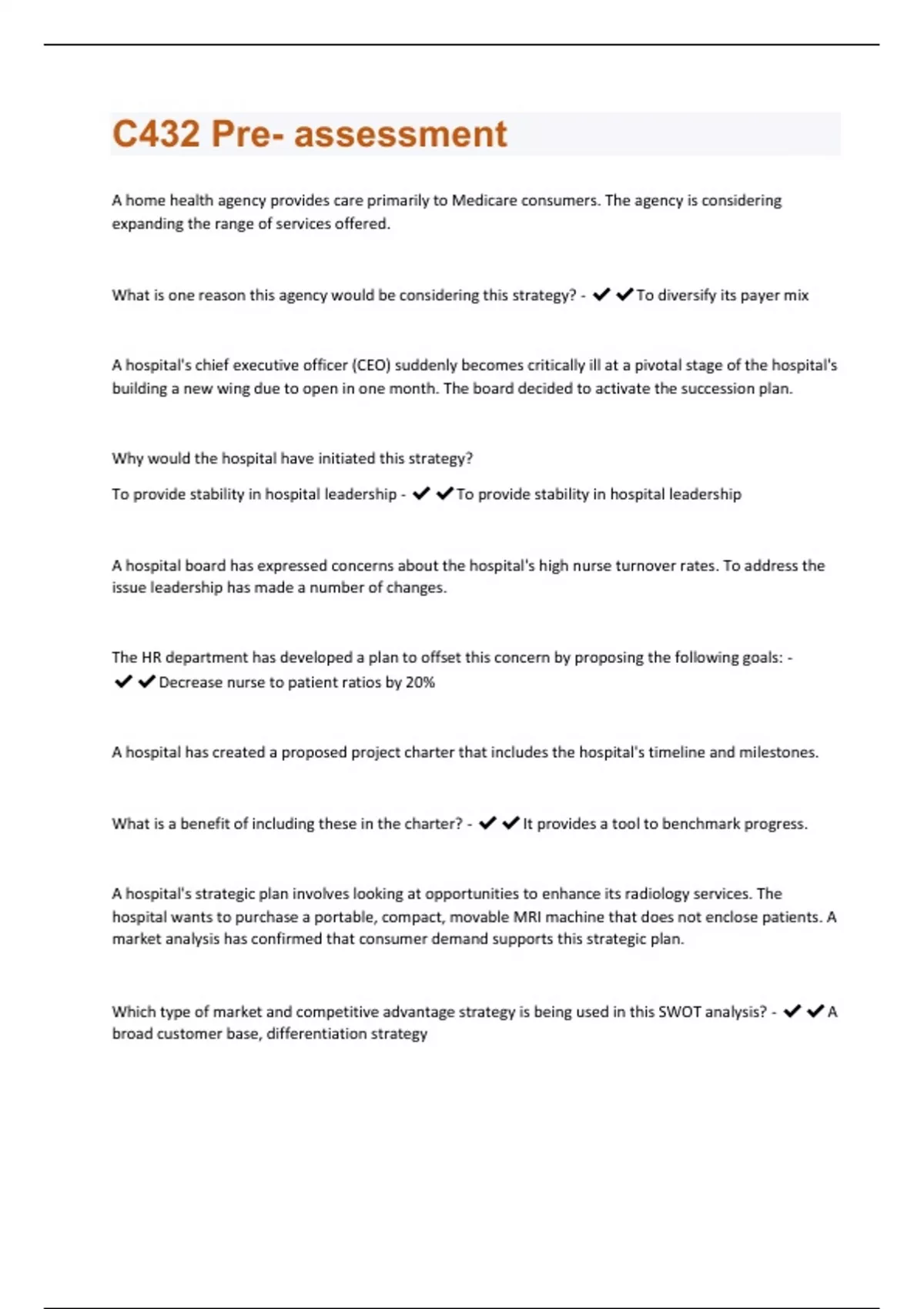 A home health agency provides care primarily to Medicare consumers. The agency is considering expanding the range of services offered. What is one reason this agency would be considering this strategy? - To diversify its payer mix A hospital's chief executive officer (CEO) suddenly becomes critically ill at a pivotal stage of the hospital's building a new wing due to open in one month. The board decided to activate the succession plan. Why would the hospital have initiated this strategy? To provide stability in hospital leadership - To provide stability in hospital leadership A hospital board has expressed concerns about the hospital's high nurse turnover rates. To address the issue leadership has made a number of changes. The HR department has developed a plan to offset this concern by proposing the following goals: - Decrease nurse to patient ratios by 20% A hospital has created a proposed project charter that includes the hospital's timeline and milestones. What is a benefit of including these in the charter? - It provides a tool to benchmark progress. A hospital's strategic plan involves looking at opportunities to enhance its radiology services. The hospital wants to purchase a portable, compact, movable MRI machine that does not enclose patients. A market analysis has confirmed that consumer demand supports this strategic plan. Which type of market and competitive advantage strategy is being used in this SWOT analysis? - A broad customer base, differentiation strategyA nursing home administrator is concerned about the number of falls occurring at the facility and wants to reduce falls by 10% over the next six months. Which tool is appropriate to evaluate this outcome? - Dashboards The chief executive officer of a healthcare system wants to know how effective its branding strategy is. The CEO is given the annual report, including the following portion: - Good will and intangible assets A CEO is interested in rewriting the organization's mission statement and has requested the annual statement for review. In which item on the above annual report is the mission statement found? - Item 1