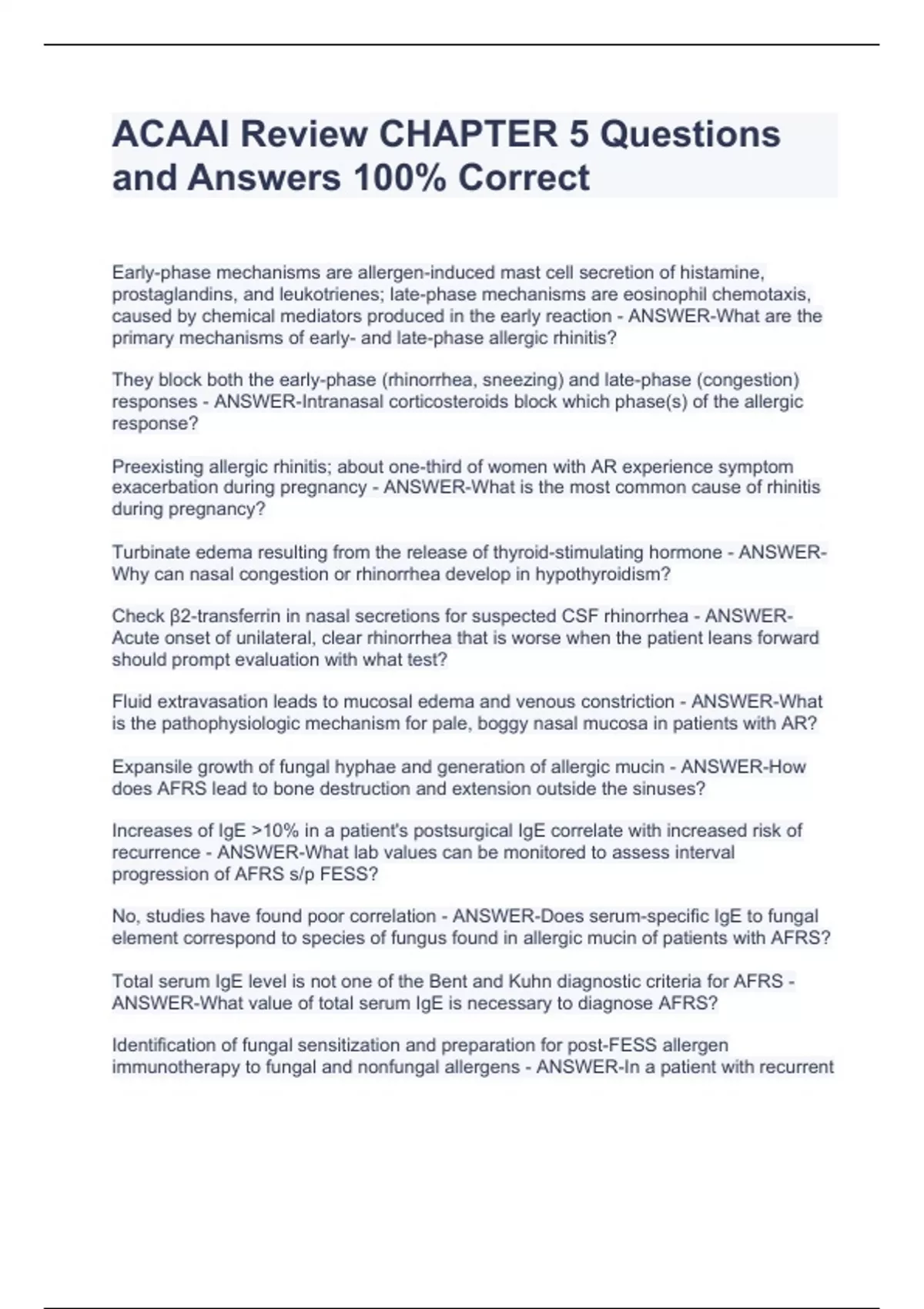 ACAAI Review CHAPTER 5 Questions and Answers 100% CorrectACAAI Review CHAPTER 5 Questions and Answers 100% CorrectACAAI Review CHAPTER 5 Questions and Answers 100% CorrectACAAI Review CHAPTER 5 Questions and Answers 100% Correct Early-phase mechanisms are allergen-induced mast cell secretion of histamine, prostaglandins, and leukotrienes; late-phase mechanisms are eosinophil chemotaxis, caused by chemical mediators produced in the early reaction - ANSWER-What are the primary mechanisms of early- and late-phase allergic rhinitis? They block both the early-phase (rhinorrhea, sneezing) and late-phase (congestion) responses - ANSWER-Intranasal corticosteroids block which phase(s) of the allergic response? Preexisting allergic rhinitis; about one-third of women with AR experience symptom exacerbation during pregnancy - ANSWER-What is the most common cause of rhinitis during pregnancy? Turbinate edema resulting from the release of thyroid-stimulating hormone - ANSWER-Why can nasal congestion or rhinorrhea develop in hypothyroidism?