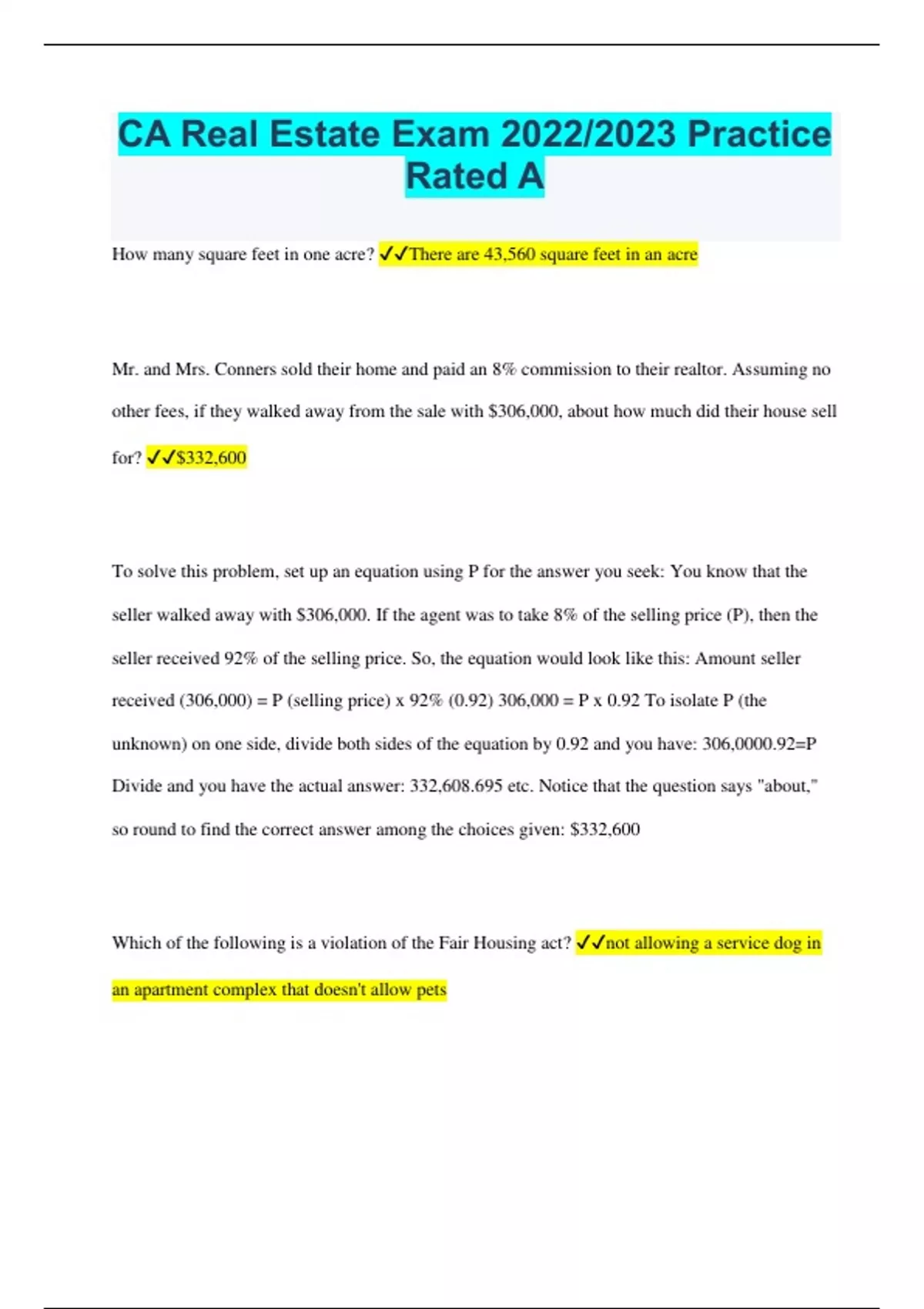 How many square feet in one acre? There are 43,560 square feet in an acre Mr. and Mrs. Conners sold their home and paid an 8% commission to their realtor. Assuming no other fees, if they walked away from the sale with $306,000, about how much did their house sell for? $332,600 To solve this problem, set up an equation using P for the answer you seek: You know that the seller walked away with $306,000. If the agent was to take 8% of the selling price (P), then the seller received 92% of the selling price. So, the equation would look like this: Amount seller received (306,000) = P (selling price) x 92% (0.92) 306,000 = P x 0.92 To isolate P (the unknown) on one side, divide both sides of the equation by 0.92 and you have: 306,0000.92=P Divide and you have the actual answer: 332,608.695 etc. Notice that the question says "about," so round to find the correct answer among the choices given: $332,600 Which of the following is a violation of the Fair Housing act? not allowing a service dog in an apartment complex that doesn't allow pets