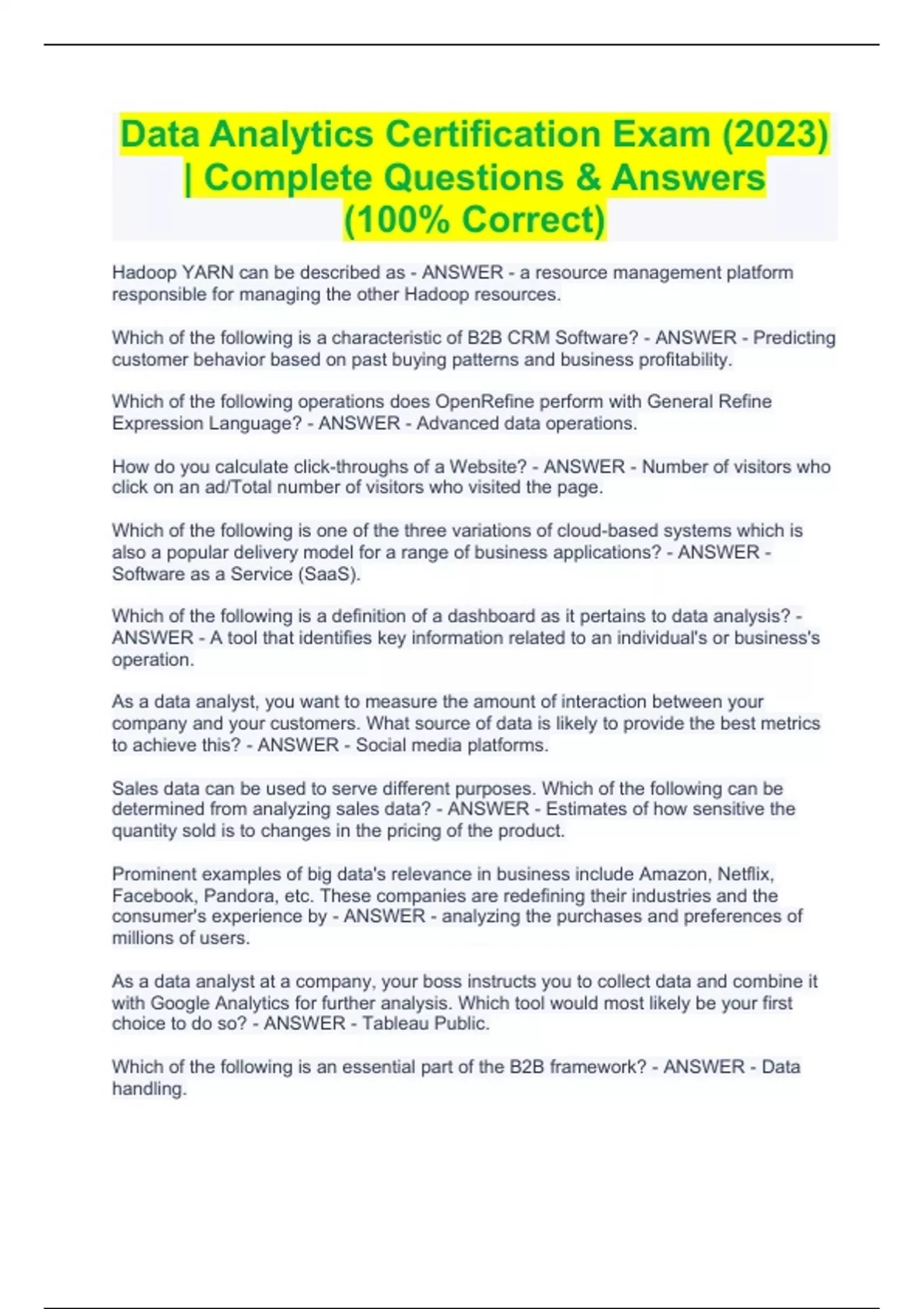 Data Analytics Certification Exam (2023) | Complete Questions & Answers (100% Correct) Data Analytics Certification Exam (2023) | Complete Questions & Answers (100% Correct) Hadoop YARN can be described as - ANSWER - a resource management platform responsible for managing the other Hadoop resources. Which of the following is a characteristic of B2B CRM Software? - ANSWER - Predicting customer behavior based on past buying patterns and business profitability. Which of the following operations does OpenRefine perform with General Refine Expression Language? - ANSWER - Advanced data operations. How do you calculate click-throughs of a Website? - ANSWER - Number of visitors who click on an ad/Total number of visitors who visited the page. Which of the following is one of the three variations of cloud-based systems which is also a popular delivery model for a range of business applications? - ANSWER - Software as a Service (SaaS). Which of the following is a definition of a dashboard as it pertains to data analysis? - ANSWER - A tool that identifies key information related to an individual's or business's operation. As a data analyst, you want to measure the amount of interaction between your company and your customers. What source of data is likely to provide the best metrics to achieve this? - ANSWER - Social media platforms. Sales data can be used to serve different purposes. Which of the following can be determined from analyzing sales data? - ANSWER - Estimates of how sensitive the quantity sold is to changes in the pricing of the product. Prominent examples of big data's relevance in business include Amazon, Netflix, Facebook, Pandora, etc. These companies are redefining their industries and the consumer's experience by - ANSWER - analyzing the purchases and preferences of millions of users. As a data analyst at a company, your boss instructs you to collect data and combine it with Google Analytics for further analysis. Which tool would most likely be your first choice to do so? - ANSWER - Tableau Public. Which of the following is an essential part of the B2B framework? - ANSWER - Data handling.