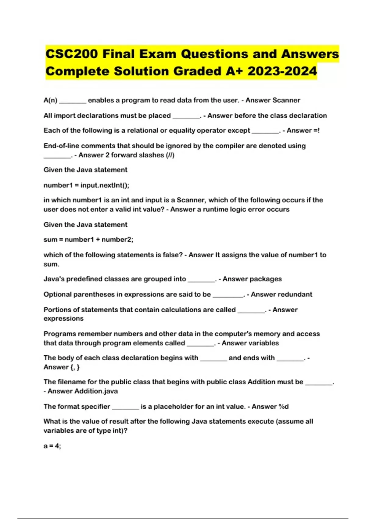 CSC200 Final Exam Practice Questions and Answers | Complete Solution . which of the following statements is false? - Answer It assigns the value of number1 to sum. Java's predefined classes are grouped into ________. - Answer packages Optional parentheses in expressions are said to be _________. - Answer redundant Portions of statements that contain calculations are called ________. - Answer expressions Programs remember numbers and other data in the computer's memory and access that data through program elements called ________. - Answer variables The body of each class declaration begins with ________ and ends with ________. - Answer {, } The filename for the public class that begins with public class Addition must be ________. - Answer A The format specifier ________ is a placeholder for an int value. - Answer %d What is the value of result after the following Java statements execute (assume all variables are of type int)? a = 4; b = 12; c = 37; d = 51; result = d % a * c + a % b + a; - Answer 119 What will be output after the following Java statements have been executed (assume all variables are of type int)? a=4; b=12; c= 37; d= 51; if(ab) print if(ab) print if(d=c) print if (c!=d) print - Answer ab c!=d When method printf requires multiple arguments, the arguments are separated with ________. - Answer commas (,) Which command compiles the Java source code file W? - Answer javac W Which command executes the Java class file W? - Answer java Welcome Which is the output of the following statements? print ("Hello"); println("World"); - Answer Hello World Which of the following escape sequences represents a carriage return? - Answer r Which of the following is a variable declaration statement? - Answer int total; Which of the following is a Scanner method for inputting an integer value? - Answer nextInt Which of the following is the escape character? - Answer Which of the following is not a Java primitive type? - Answer real Which of the following is not a compilation error? - Answer Placing a semicolon at the end of the first line of an if statement. Which of the following is not a valid Java identifier? - Answer my Value Which of the following statements does not alter the value stored in a memory location? - Answer int a; Which of the following statements is false? - Answer Variable name identifiers must begin with a lowercase letter. Which of the following statements is true? - Answer All of these are true. (package, class names, enter your age) Which of the following statements would display the phrase Java is fun? - Answer Sln("hellois funrJava "); How many times is the body of the loop below executed? int c = 1; while (c20) c--; - Answer 0 In an expression containing values of the types int and double, the ________ values are ________ to ________ values for use in the expression. - Answer int, promoted, double Local variables must be ________. - Answer initialized before their values are used in an expression Sentinel-controlled repetition is also known as ________. - Answer indefinite repetition The empty statement is denoted by what symbol? - Answer parentheses () What does the expression x %= 10 do? - Answer Divides x by 10 and stores the remainder in x. Which of the following is a double-selection control statement? - Answer if...else Which of the following is not a Java keyword? - Answer next Which of the following is not a control structure? - Answer declaration structure Which of the following is not a primitive type? - Answer String Which of the following operators associates from left to right? - Answer / Which of the following statements about the conditional operator (?:) is false? - Answer The second operand is the result value if the condition evaluates to false. Which of the following statements is false? - Answer Cast operators associate from right to left and are one level lower in precedence than the multiplicative operators. Which of the following statements is true? - Answer Syntax errors are caught by the compiler. Logic errors have effects at execution time. Consider the following two Java code segments: - Answer Both The output from these segments is not the same and The scope of the control variable i is different for the two segments are true. Counter-controlled repetition requires ________. - Answer all of these The control variable of a counter-controlled loop should be declared as ________ to prevent errors. - Answer int To exit out of a loop completely, and resume the flow of control at the next statement after the loop, use a ________. - Answer break statement Which expression is equivalent to if (!(grade == sentinelValue))? - Answer if (grade != sentinelValue) Which formatting flag indicates that the floating-point values should be output with a thousands separator? - Answer comma (,) Which of the following is equivalent to this code segment? - Answer int total = 0; for (int i = 0; i = 20; total += i, i += 2); Which of the following is not a type of repetition statement in Java? - Answer loop statement Which of the following statements about a do...while repetition statement is true? - Answer The body of a do...while loop is always executed at least once. Which of the following statements about the break statement is false? - Answer The break statement, when executed in a while, for or do...while, skips the remaining statements in the loop body and proceeds with the next iteration of the loop. Which of the following statements about the continue statement is true? - Answer A continue statement proceeds with the next iteration of the immediately enclosing while, for, do...while statement. Which statement prints the floating-point value 123.456 right justified with a field width of 10? - Answer Sf("%10.3f", 123.456); boolean values can be displayed as the words true and false with the ________ format specifier. - Answer %b The preferred way to traverse a two-dimensional array is to use ________. - Answer two nested for statements Which of the following 