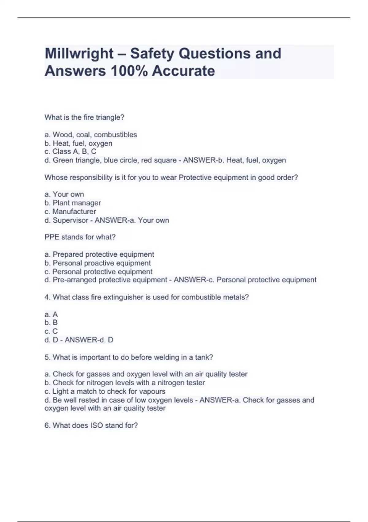 Millwright – Safety Questions and Answers 100% Accurate Millwright – Safety Questions and Answers 100% Accurate Millwright – Safety Questions and Answers 100% Accurate Millwright – Safety Questions and Answers 100% Accurate What is the fire triangle? a. Wood, coal, combustibles b. Heat, fuel, oxygen c. Class A, B, C d. Green triangle, blue circle, red square - ANSWER-b. Heat, fuel, oxygen Whose responsibility is it for you to wear Protective equipment in good order? a. Your own b. Plant manager c. Manufacturer d. Supervisor - ANSWER-a. Your own PPE stands for what? a. Prepared protective equipment b. Personal proactive equipment c. Personal protective equipment d. Pre-arranged protective equipment - ANSWER-c. Personal protective equipment 4. What class fire extinguisher is used for combustible metals?