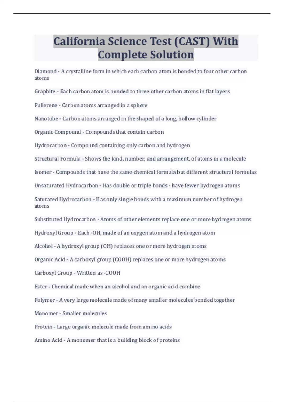 California Science Test (CAST) With Complete Solution