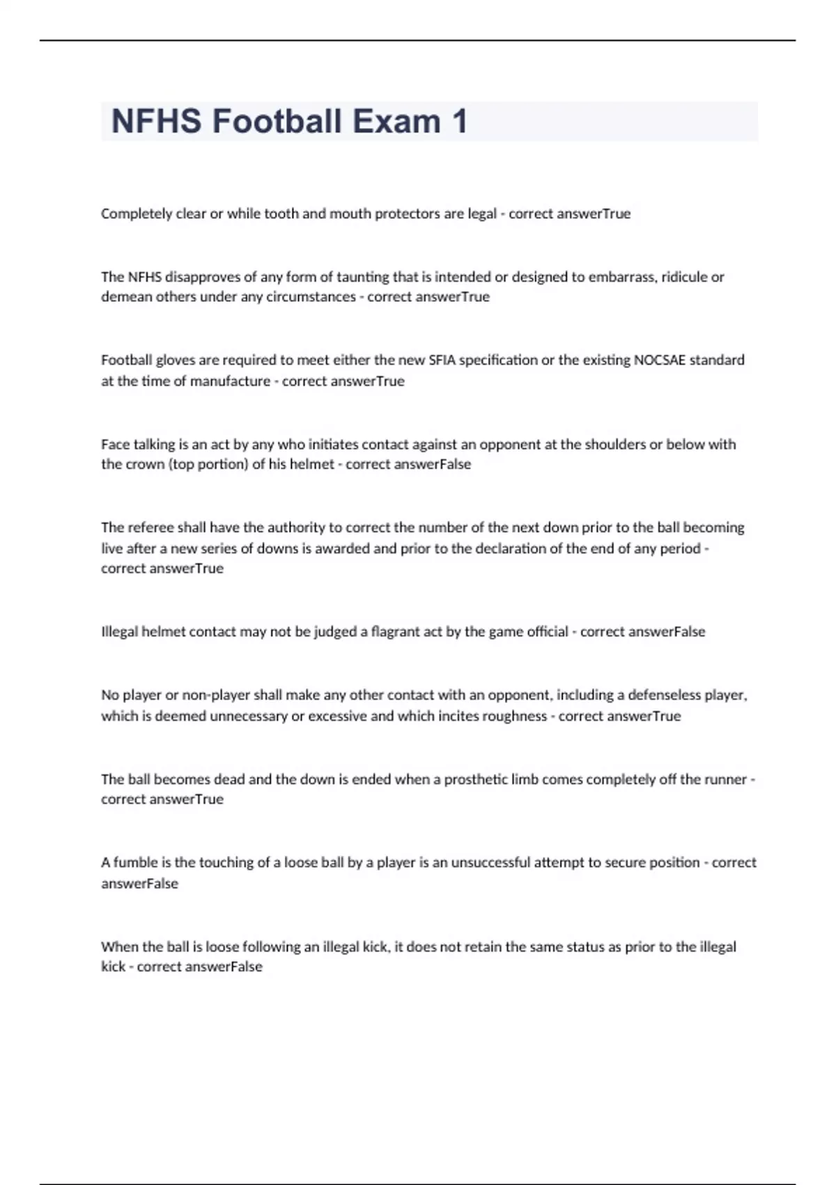 Completely clear or while tooth and mouth protectors are legal - correct answerTrue The NFHS disapproves of any form of taunting that is intended or designed to embarrass, ridicule or demean others under any circumstances - correct answerTrue Football gloves are required to meet either the new SFIA specification or the existing NOCSAE standard at the time of manufacture - correct answerTrue Face talking is an act by any who initiates contact against an opponent at the shoulders or below with the crown (top portion) of his helmet - correct answerFalse The referee shall have the authority to correct the number of the next down prior to the ball becoming live after a new series of downs is awarded and prior to the declaration of the end of any period - correct answerTrue Illegal helmet contact may not be judged a flagrant act by the game official - correct answerFalse No player or non-player shall make any other contact with an opponent, including a defenseless player, which is deemed unnecessary or excessive and which incites roughness - correct answerTrue The ball becomes dead and the down is ended when a prosthetic limb comes completely off the runner - correct answerTrue A fumble is the touching of a loos