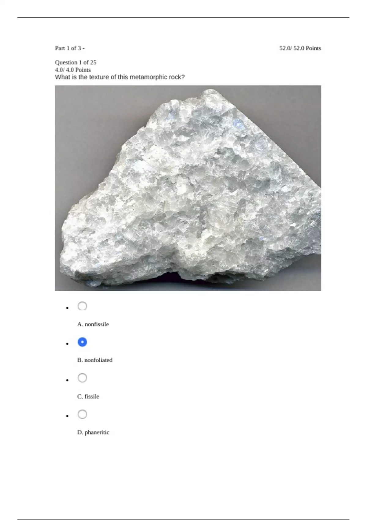 Question 1 of 25 4.0/ 4.0 Points What is the texture of this metamorphic rock? A. nonfissile B. nonfoliated C. fissile D. phaneritic E. foliated Question 2 of 25 4.0/ 4.0 Points The core of a mountain range that formed during regional metamorphism would contain a _____ metamorphic facies. A. phaneritic B. high-grade C. low-grade D. moderate-grade E. blueschist Question 3 of 25 4.0/ 4.0 Points Heat promotes recrystallization by A. stripping away valence electrons B. separating