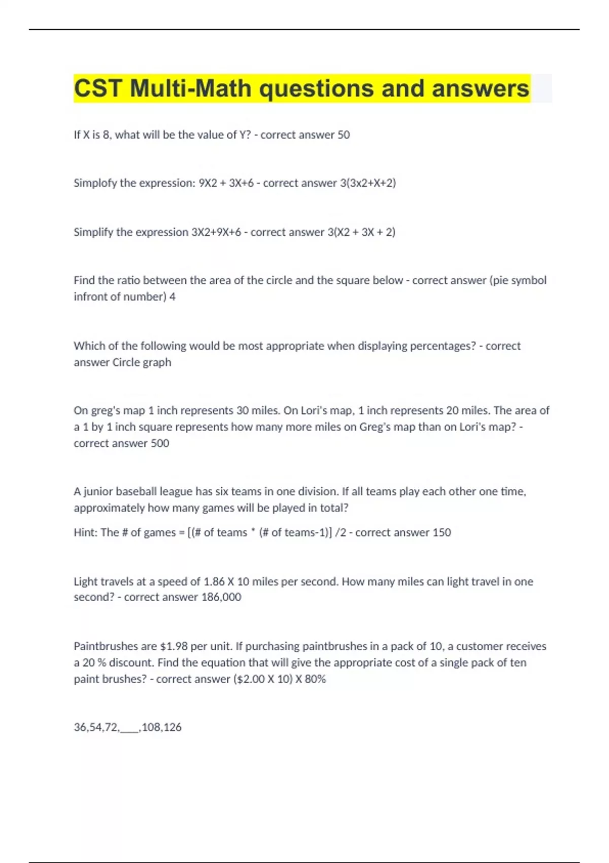 If X is 8, what will be the value of Y? 50 Simplofy the expression: 9X2 + 3X+6 3(3x2+X+2) Simplify the expression 3X2+9X+6 3(X2 + 3X + 2) Find the ratio between the area of the circle and the square below (pie symbol infront of number) 4 Which of the following would be most appropriate when displaying percentages? Circle graph On greg's map 1 inch represents 30 miles. On Lori's map, 1 inch represents 20 miles. The area of a 1 by 1 inch square represents how many more miles on Greg's map than on Lori's map? 500 A junior baseball league has six teams in one division. If all teams play each other one time, approximately how many games will be played in total? Hint: The # of games = [(# of teams * (# of teams-1)] /2 150 Light travels at a speed of 1.86 X 10 miles per second. How many miles can light travel in one second? 186,000 Paintbrushes are $1.98 per unit. If purchasing paintbrushes in a pack of 10, a customer receives a 20 % discount. Find the equation that will give the appropriate cost of a single pack of ten paint brushes? ($2.00 X 10) X 80% 36,54,72,___,108,126 To solve the missing number in the pattern above, which would be most significant? A number divisible by 18 A large organization has been sending 200 letters asking for donations for the past five years. Each year they receive donations from 80% of the letters sent. The president of the organization wants to increase donations by 20%. How many letters should be sent out to meet this goal? 250 Which would be the most appropriate way to display data when graphing ethnicity in an elementary school? Circle Graph Bobby traveled 16 miles in one hour. He traveled the first 10 miles in 1/3 of an hours. How many mph did he travel the rest of the day? 9 Maria takes 12 minutes to eat breakfast. Maria knows that it never takes her more than 30 minutes to eat breakfast and drive to work. Which inequality statement best represents the information provided? 12 + T 30 James is 7 years older than Mary, but 4 years younger than Susan. Which of the following best represents the statement presented? Mary James Susan Solve for X: 15x + 11=17x +27 - 2y x=y-8 Which of the following must be symmetrical? An equilateral triangle Which equation best describes the relationship between X and Y? X-1 = Y-3 Reprsent (7,-4) C To deliver a package a delivery man goes 6 miles east from town R to town S, then 8 miles north to town T. How many miles shorter would it be to go directly from town R to town T? 4 In order to construct garments a company is using the information below: 5 yards of yarn are needed for 20 garments 10 yards of yarn are needed for 35 garments 15 yards of yarn are needed for 50 garments 20 yards of yarn are needed for 65 garments If X represents the yarn, which of the equations below explains the relationship? X+5= y + 15