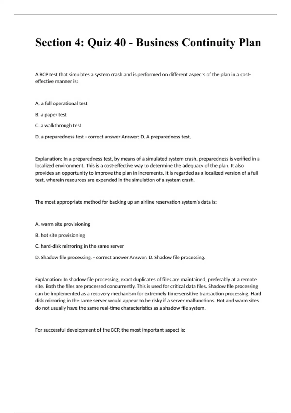 Section 4 Quiz 40 - Business Continuity Plan question n answers 2023