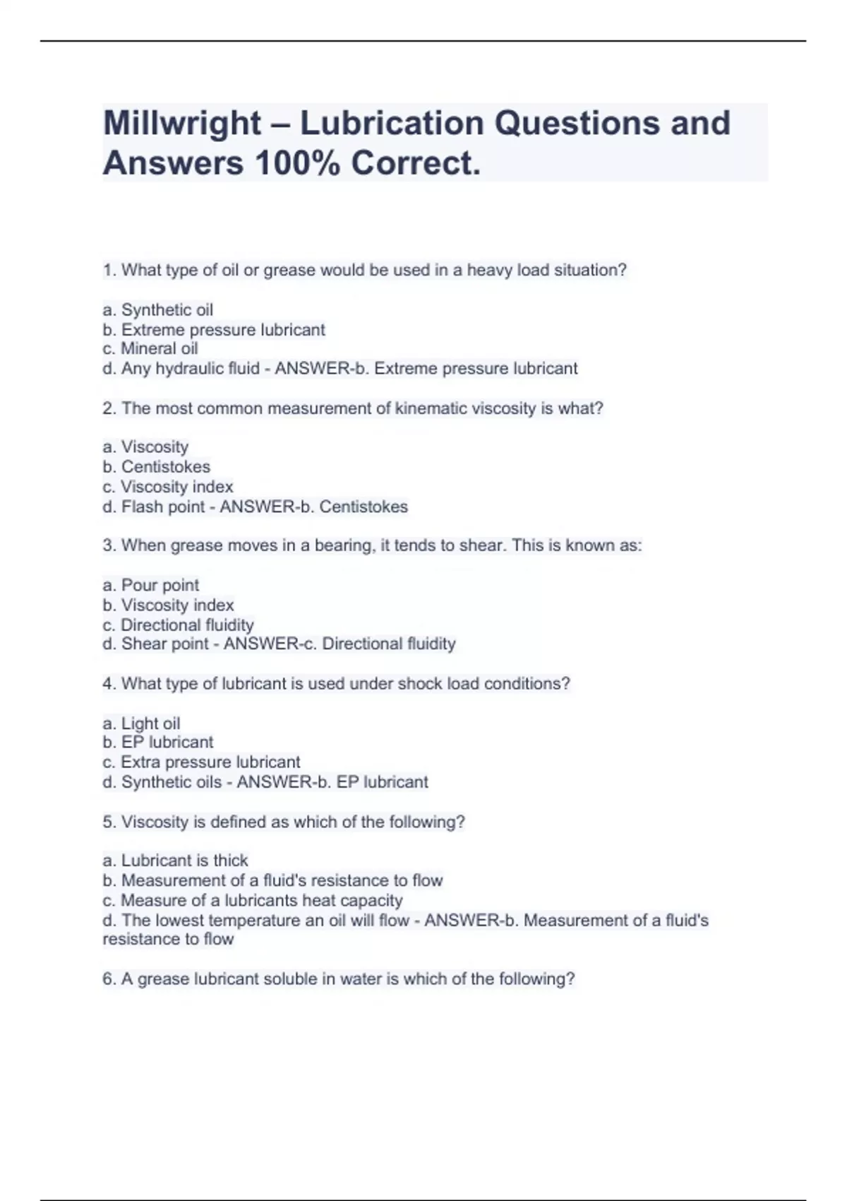 1. What type of oil or grease would be used in a heavy load situation? a. Synthetic oil b. Extreme pressure lubricant c. Mineral oil d. Any hydraulic fluid - ANSWER-b. Extreme pressure lubricant 2. The most common measurement of kinematic viscosity is what? a. Viscosity b. Centistokes c. Viscosity index d. Flash point - ANSWER-b. Centistokes 3. When grease moves in a bearing, it tends to shear. This is known as: a. Pour point b. Viscosity index c. Directional fluidity d. Shear point - ANSWER-c. Directional fluidity 4. What type of lubricant is used under shock load conditions? a. Light oil b. EP lubricant c. Extra pressure lubricant d. Synthetic oils - ANSWER-b. EP lubricant 5. Viscosity is defined as which of the following