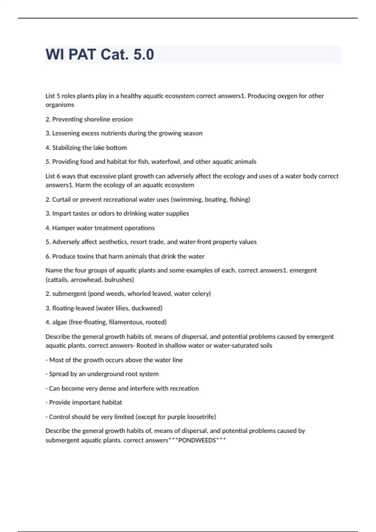 List 5 roles plants play in a healthy aquatic ecosystem correct answers1. Producing oxygen for other organisms 2. Preventing shoreline erosion 3. Lessening excess nutrients during the growing season 4. Stabilizing the lake bottom 5. Providing food and habitat for fish, waterfowl, and other aquatic animals List 6 ways that excessive plant growth can adversely affect the ecology and uses of a water body correct answers1. Harm the ecology of an aquatic ecosystem 2. Curtail or prevent recreational water uses (swimming, boating, fishing) 3. Impart tastes or odors to drinking water supplies 4. Hamper water treatment operations 5. Adversely affect aesthetics, resort trade, and water-front property values 6. Produce toxins that harm animals that drink the water Name the four groups of aquatic plants and some examples of each. correct answers1. emergent (cattails, arrowhead, bulrushes) 2. submergent (pond weeds, whorled leaved, water celery) 3. floating-leaved (water lilies, duckweed) 4. algae (free-floating, filamentous, rooted) Describe the general growth habits of, means of dispersal, and potential problems caused by emergent aquatic plants. correct answers- Rooted in shallow water or water-saturated soils - Most of the growth occurs above the water line - Spread by an underground root system - Can become very dense and interfere with recreation - Provide important habitat - Control should be very limited (except for purple loosetrife) Describe the general growth habits of, means of dispersal, and potential problems caused by submergent aquatic plants. correct answers***PONDWEEDS***