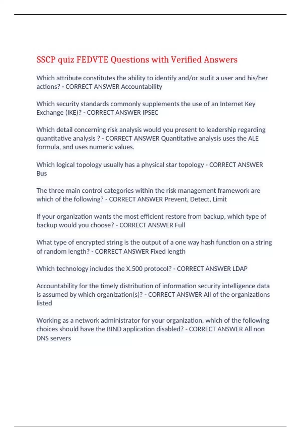 SSCP quiz FEDVTE Questions with Verified Answers Which attribute constitutes the ability to identify and/or audit a user and his/her actions? - CORRECT ANSWER Accountability Which security standards commonly supplements the use of an Internet Key Exchange (IKE)? - CORRECT ANSWER IPSEC Which detail concerning risk analysis would you present to leadership regarding quantitative analysis ? - CORRECT ANSWER Quantitative analysis uses the ALE formula, and uses numeric values. Which logical topology usually has a physical star topology - CORRECT ANSWER Bus The three main control categories within the risk management framework are which of the following? - CORRECT ANSWER Prevent, Detect, Limit If your organization wants the most efficient restore from backup, which type of backup would you choose? - CORRECT ANSWER Full What type of encrypted string is the output of a one way hash function on a string of random length? - CORRECT ANSWER Fixed length Which technology includes the X.500 protocol? - CORRECT ANSWER LDAP Accountability for the timely distribution of information security intelligence data is assumed by which organization(s)? - CORRECT ANSWER All of the organizations listed Working as a network administrator for your organization, which of the following choices should have the BIND application disabled? - CORRECT ANSWER All non DNS servers Which form of cryptography includes AES, Blowfish, DES, and 3DES? - CORRECT ANSWER Secret Key When a user enters a URL in the address bar and presses RETURN, what Internet service converts the text to the IP address, 216.230.195.151? - CORRECT ANSWER DNS Which category of tools or initiatives is implemented for the goal of neutralizing threats and vulnerabilities? - CORRECT ANSWER Countermeasures Protection levels and certain integrity levels are maintained by which standard listed below? - CORRECT ANSWER Due Care Which term describes an information systems ability to identify, track, and monitor individuals and their behavior? - CORRECT ANSWER Accountability Which of the following choices are part of the risk mitigation process? - CORRECT ANSWER Conduct a cost-benefit analysis