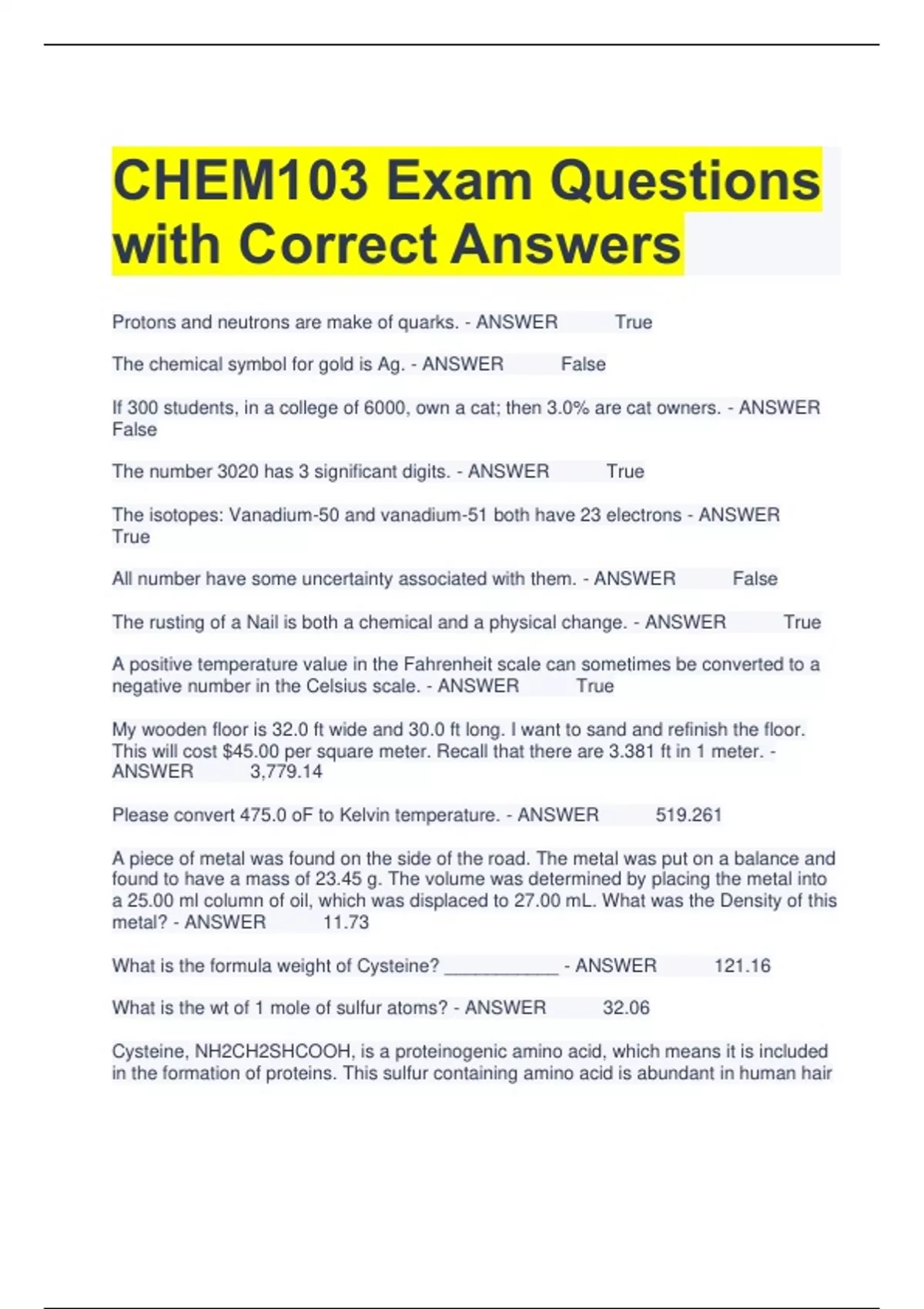 CHEM103 Exam Questions with Correct Answers Protons and neutrons are make of quarks. - ANSWER True The chemical symbol for gold is Ag. - ANSWER False If 300 students, in a college of 6000, own a cat; then 3.0% are cat owners. - ANSWER False The number 3020 has 3 significant digits. - ANSWER True The isotopes: Vanadium-50 and vanadium-51 both have 23 electrons - ANSWER True All number have some uncertainty associated with them. - ANSWER False The rusting of a Nail is both a chemical and a physical change. - ANSWER True A positive temperature value in the Fahrenheit scale can sometimes be converted to a negative number in the Celsius scale. - ANSWER True My wooden floor is 32.0 ft wide and 30.0 ft long. I want to sand and refinish the floor. This will cost $45.00 per square meter. Recall that there are 3.381 ft in 1 meter. - ANSWER 3,779.14 Please convert 475.0 oF to Kelvin temperature. - ANSWER 519.261 A piece of metal was found on the side of the road. The metal was put on a balance and found to have a mass of 23.45 g. The volume was determined by placing the metal into a 25.00 ml column of oil, which was displaced to 27.00 mL. What was the Density of this metal? - ANSWER 11.73 What is the formula weight of Cysteine? ___________ - ANSWER 121.16 What is the wt of 1 mole of sulfur atoms? - ANSWER 32.06 Cysteine, NH2CH2SHCOOH, is a proteinogenic amino acid, which means it is included in the formation of proteins. This sulfur containing amino acid is abundant in human hair and in high end hair care products. Given a 35.00 g sample of cysteine, calculate the grams of S atoms present. - ANSWER 9.26 What is the formula weight of Ethane, CH3-CH3? ___________ - ANSWER 30.97