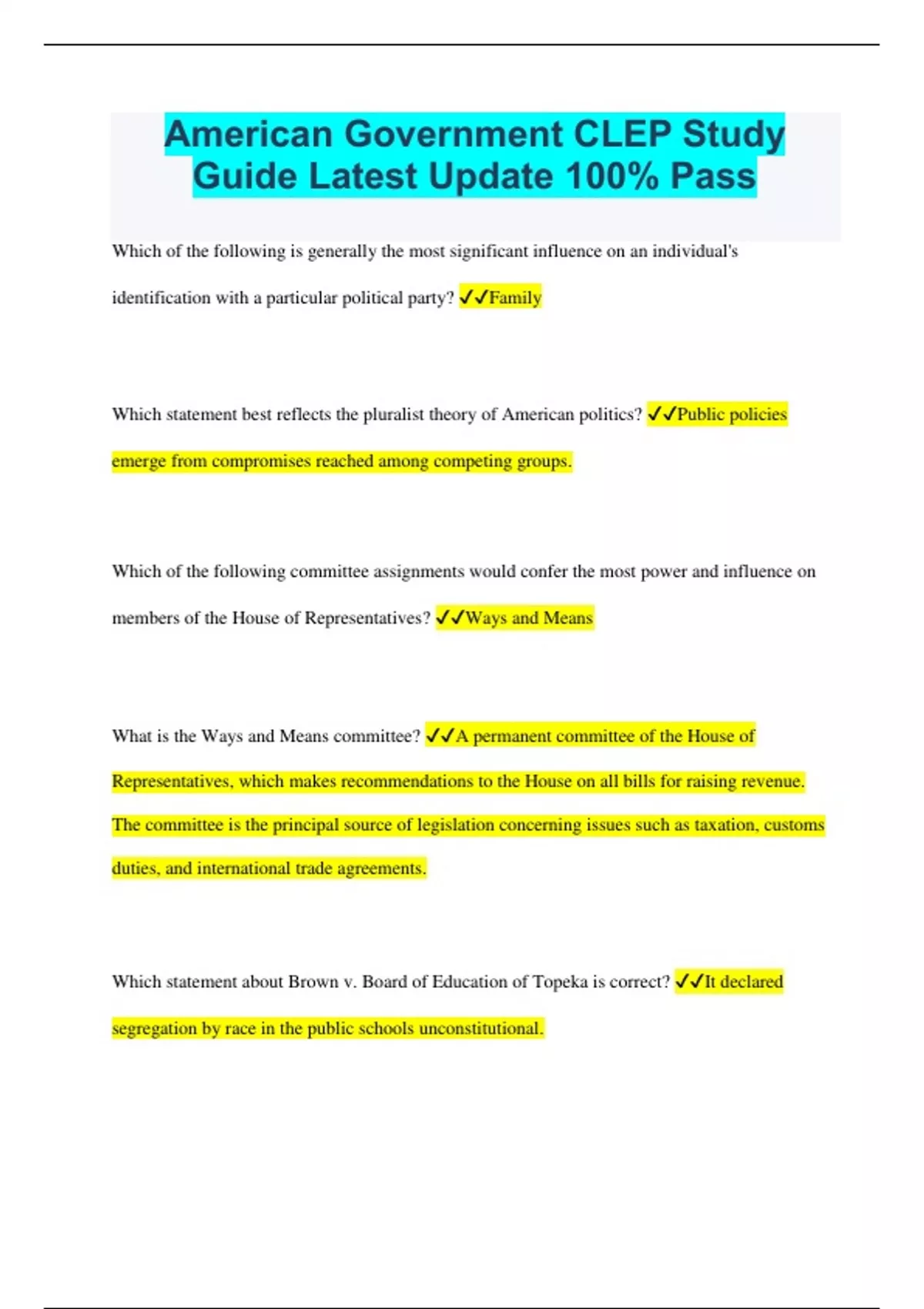 American Government CLEP Study Guide Latest Update 100% Pass Which of the following is generally the most significant influence on an individual's identification with a particular political party? Family Which statement best reflects the pluralist theory of American politics? Public policies emerge from compromises reached among competing groups. Which of the following committee assignments would confer the most power and influence on members of the House of Representatives? Ways and Means What is the Ways and Means committee? A permanent committee of the House of Representatives, which makes recommendations to the House on all bills for raising revenue. The committee is the principal source of legislation concerning issues such as taxation, customs duties, and international trade agreements. Which statement about Brown v. Board of Education of Topeka is correct? It declared segregation by race in the public schools unconstitutional. Prior to the Voting Rights Act of 1965, literacy tests were used by some southern states to... Prevent African Americans from exercising their right to vote. The practice whereby individual senators can veto federal judicial nominations in their respective states is called Senatorial courtesy Differences between House and Senate versions of a bill are resolved... in a conference room meeting. Which of the following principles protects a citizen from imprisonment without trial Due process The passage of legislation in Congress often depends on mutual accommodations among members. This suggests that, to some extent, congressional behavior is based on Deference to state legislatures The following statements accurately describe the president's veto power 1. A president sometimes threatens to veto a bill that is under discussion in order to influence congressional decision making. 2. Congress is usually unable to override a president's veto. All of the following issues were decided at the constitutional Convention of 1787 Representation in the legislature; the method of electing the president; congressional power to override a presidential veto; qualifications for members of the House and Senate This is an example of soft money Money that is given to a political party for advertisements about the party's goals The usefulness to the president of having cabinet members as political advisers is undermined by the fact that the loyalties of cabinet members are often divided between loyalty to the president and loyalty to their own executive departments. In the electoral history of the United States third parties have