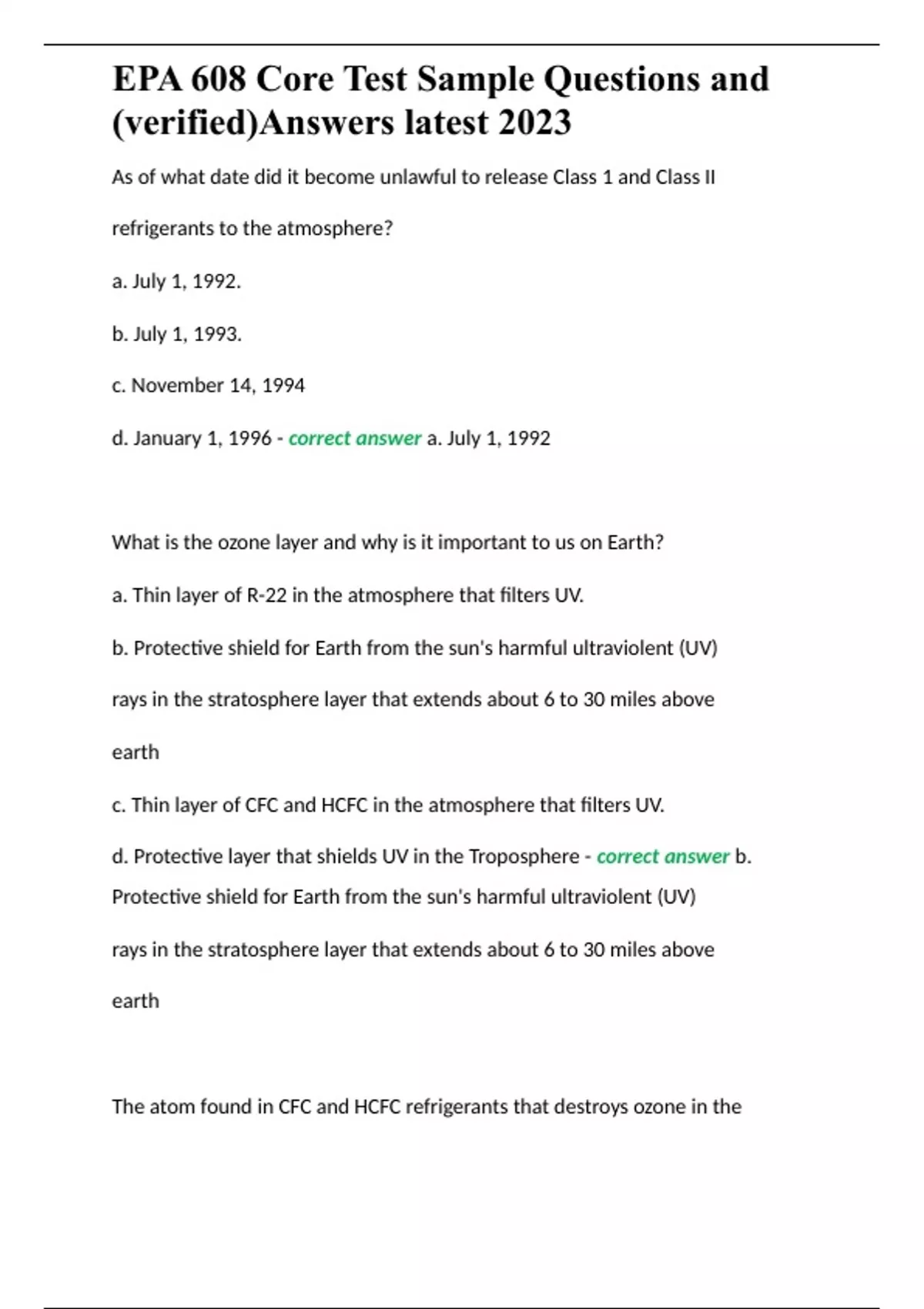 EPA 608 Core Test Sample Questions and (verified)Answers latest 2023.docx