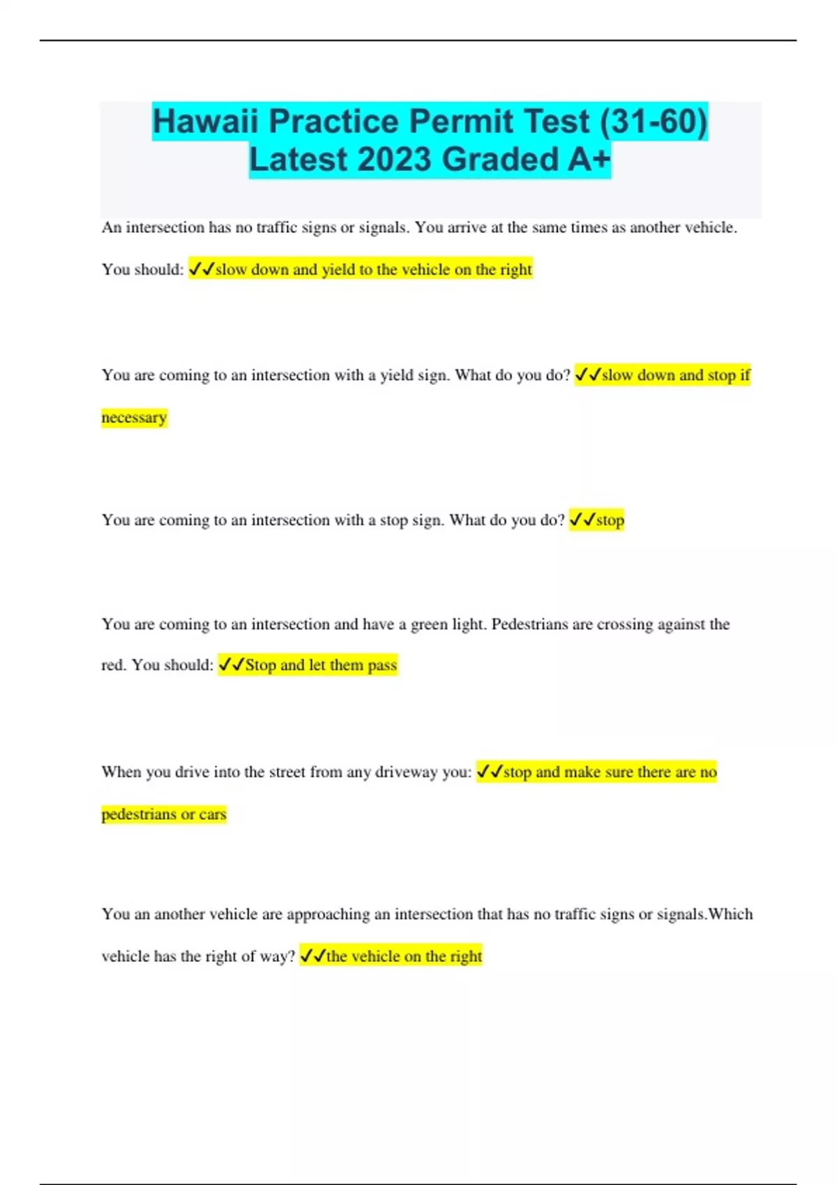 Hawaii Practice Permit Test (31-60) Latest 2023 Graded A+