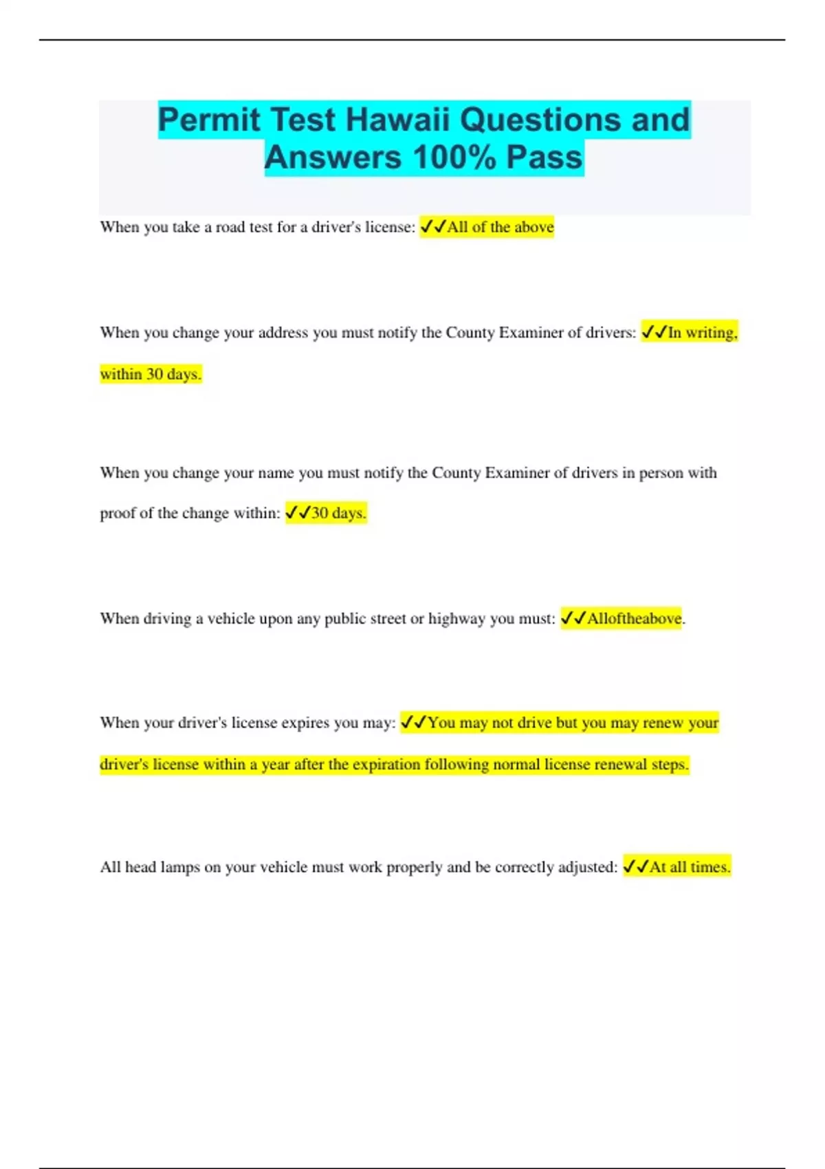 When you take a road test for a driver's license: All of the above When you change your address you must notify the County Examiner of drivers: In writing, within 30 days. When you change your name you must notify the County Examiner of drivers in person with proof of the change within: 30 days.